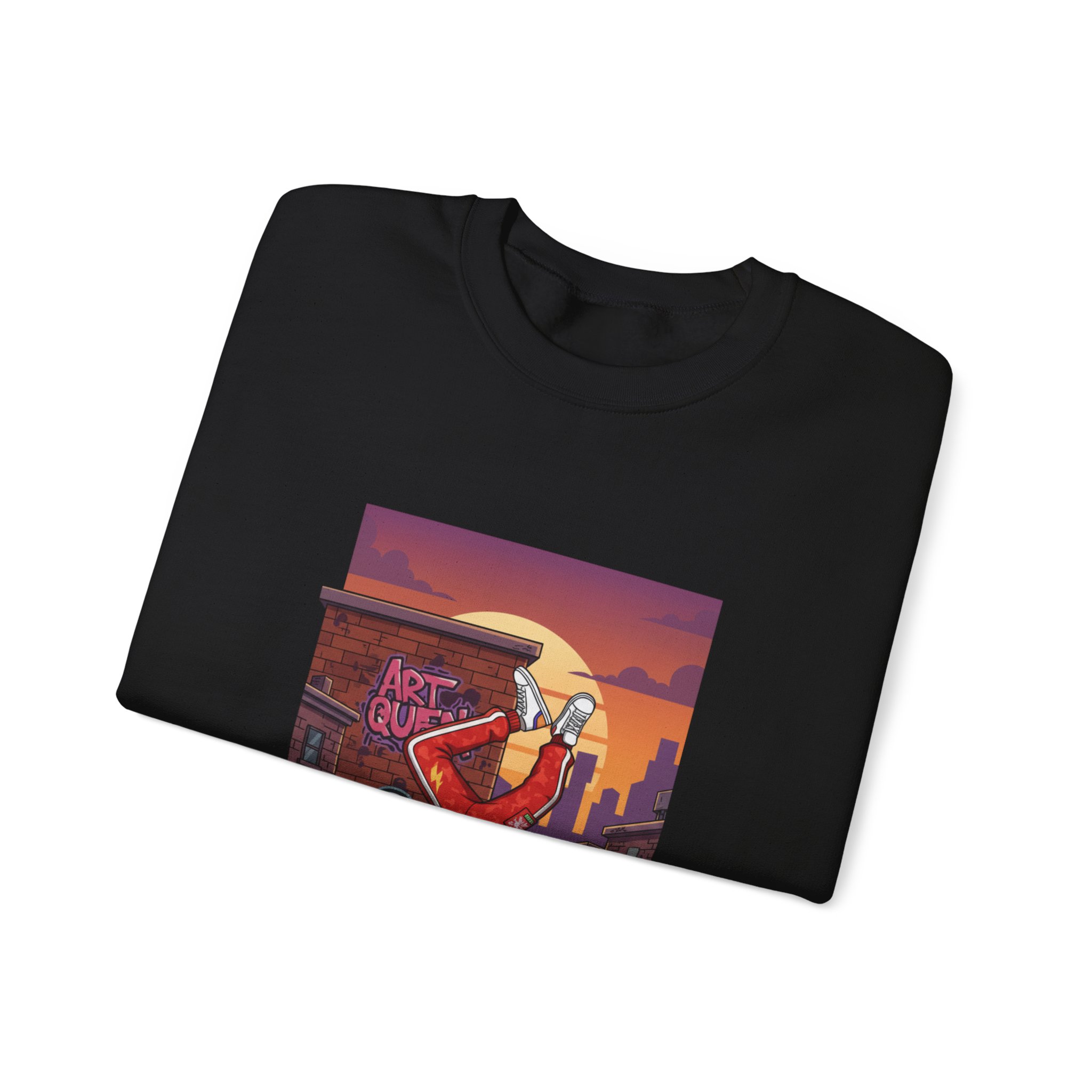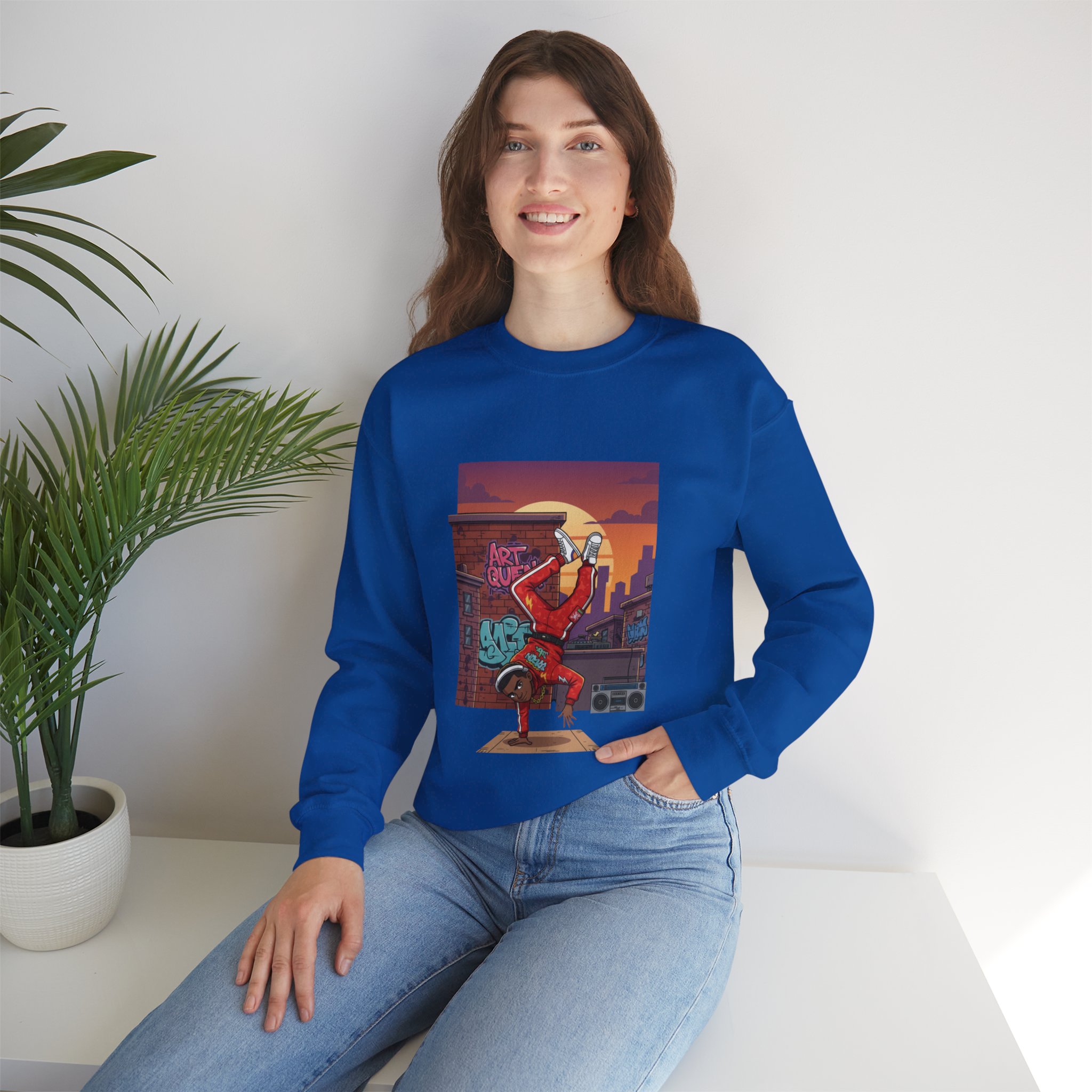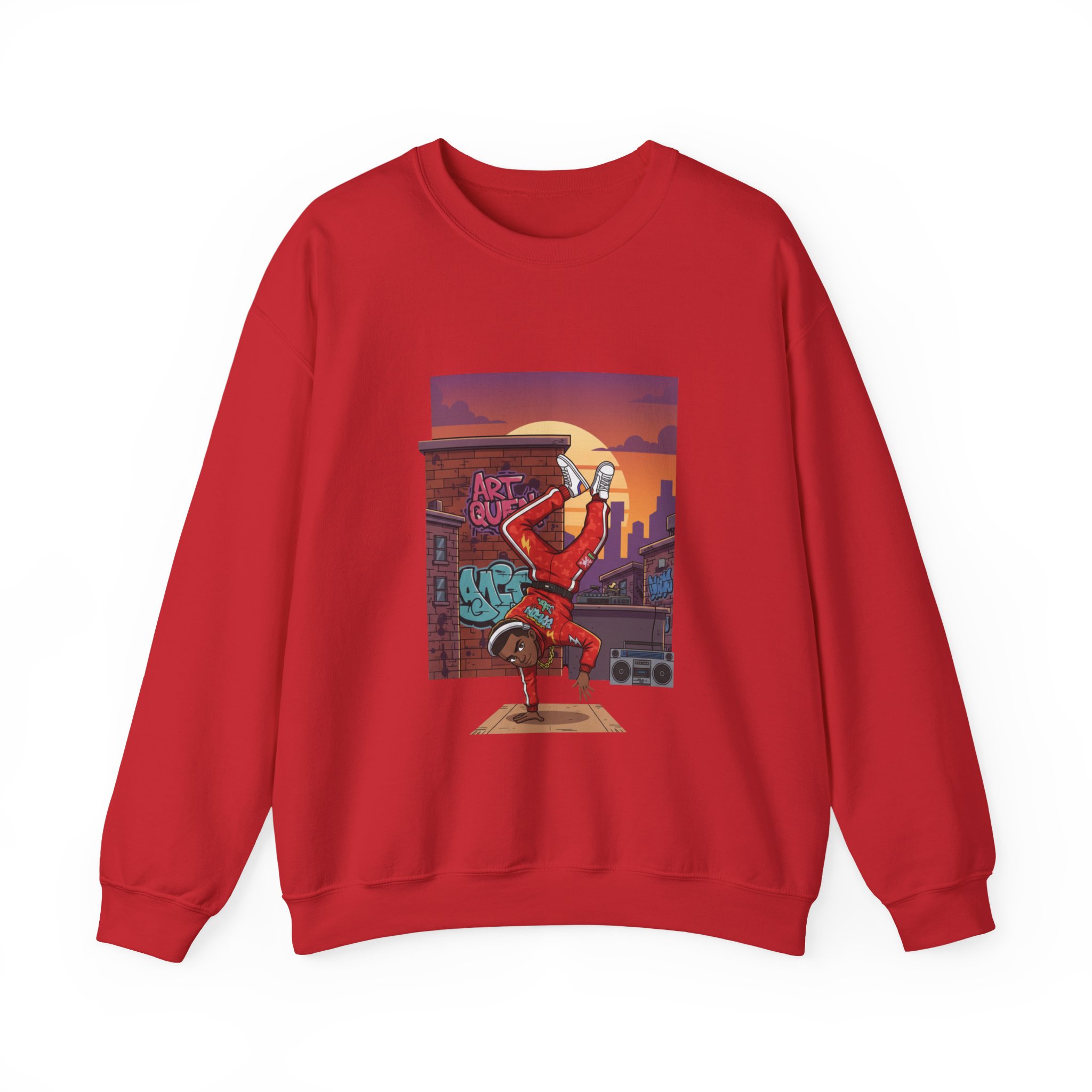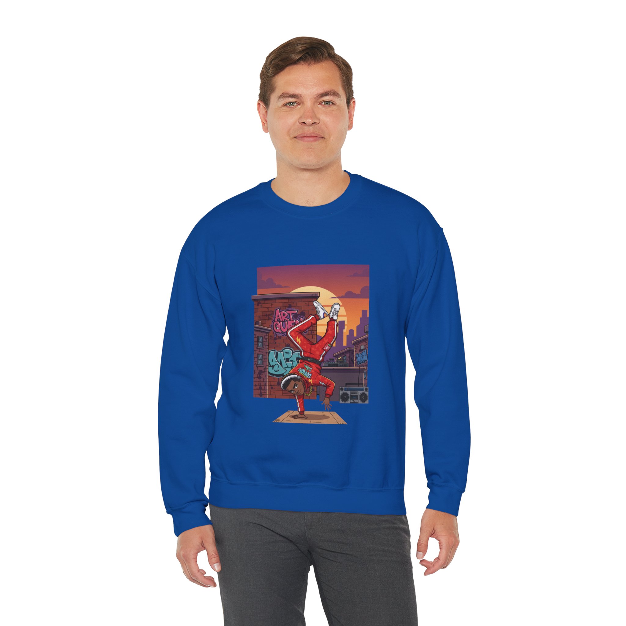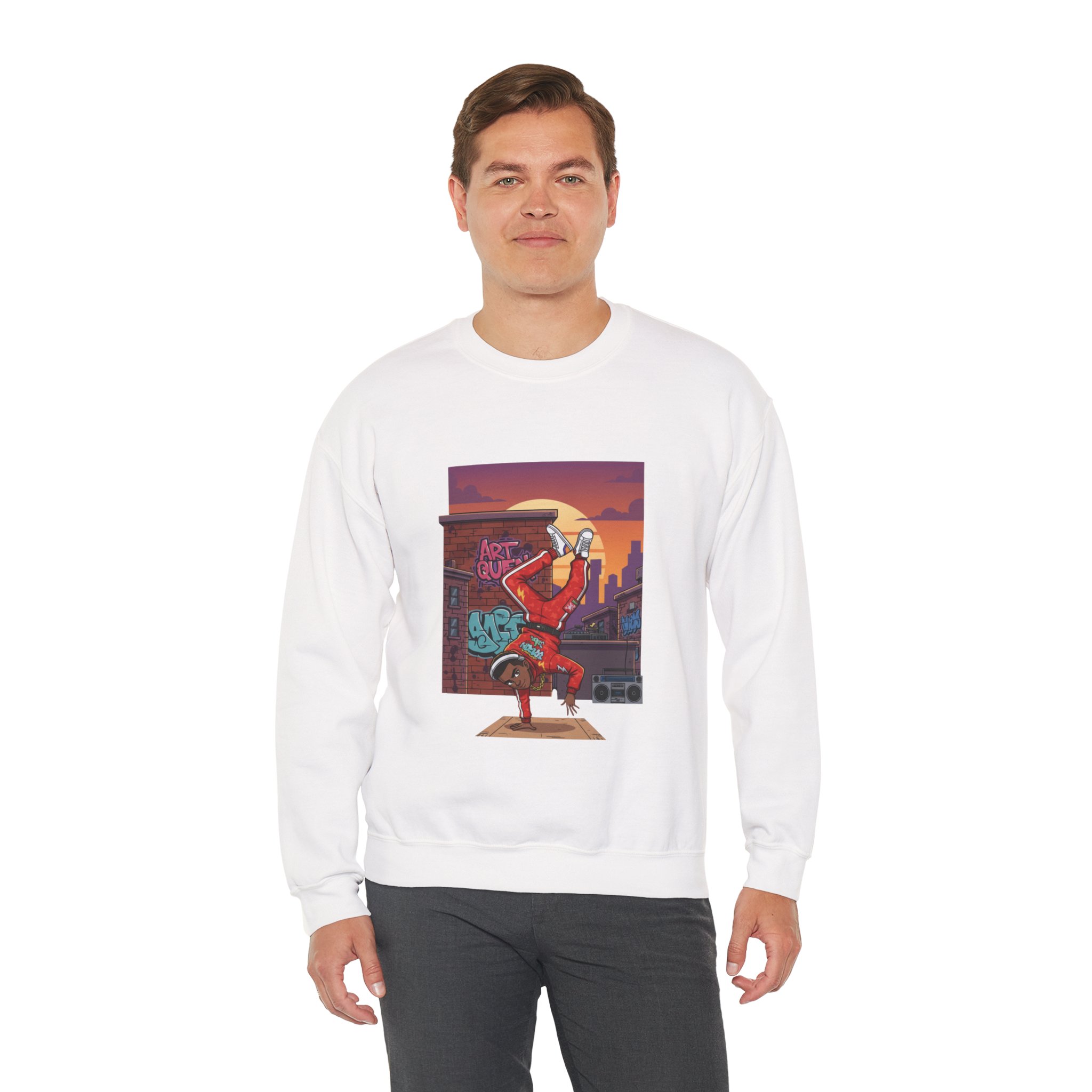 This cozy crewneck sweatshirt carries streetwise energy and everyday comfort. The front art shows a breakdancer mid-freeze against a sunset cityscape and graffiti brick wall — bold color and motion that stay vibrant thanks to DTG printing. The medium-heavy 50/50 cotton-poly blend and double-needle stitching make it sturdy for frequent wear, while the tubular knit body and ribbed collar hold shape wash after wash. It’s roomy in a classic fit, with soft tear-away neck label and OEKO-TEX certified dyes for a safer, more responsible finish. Wear it to rehearse moves, stroll the neighborhood, or warm up between sets — it feels lived-in from the first pull-over.