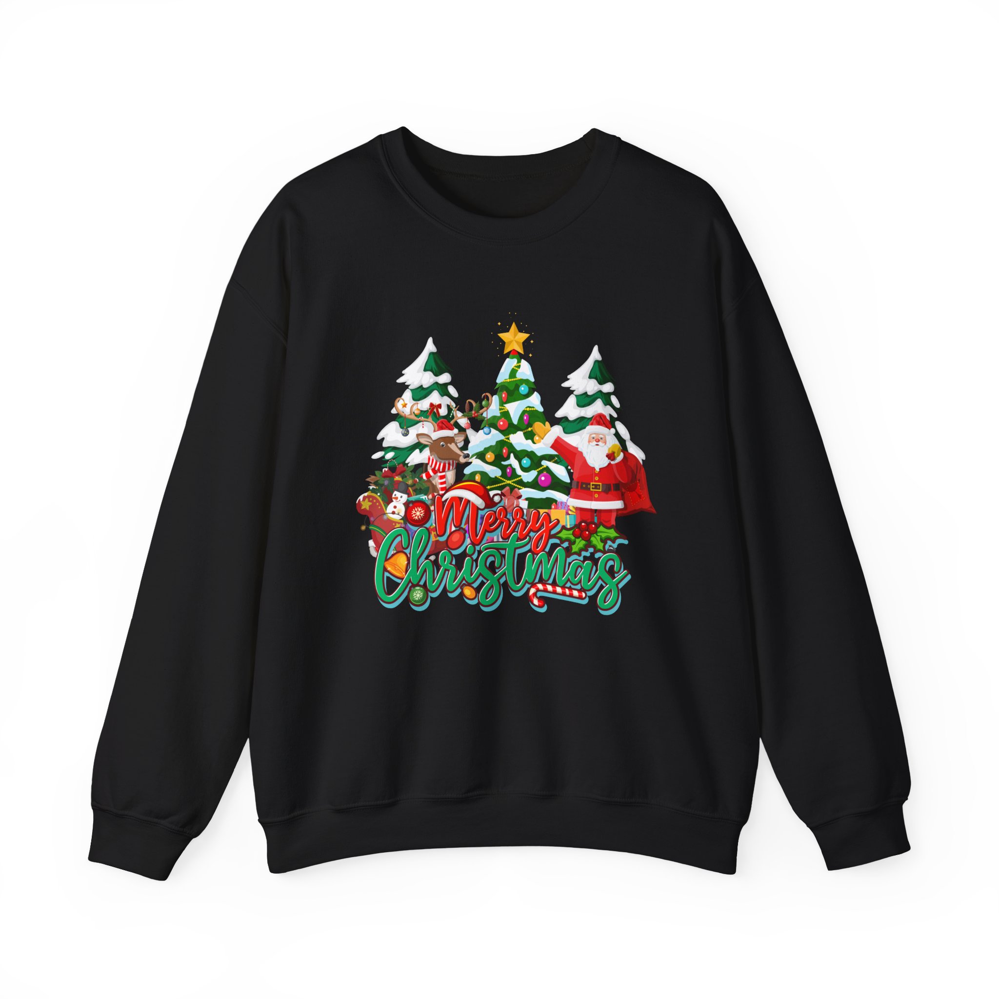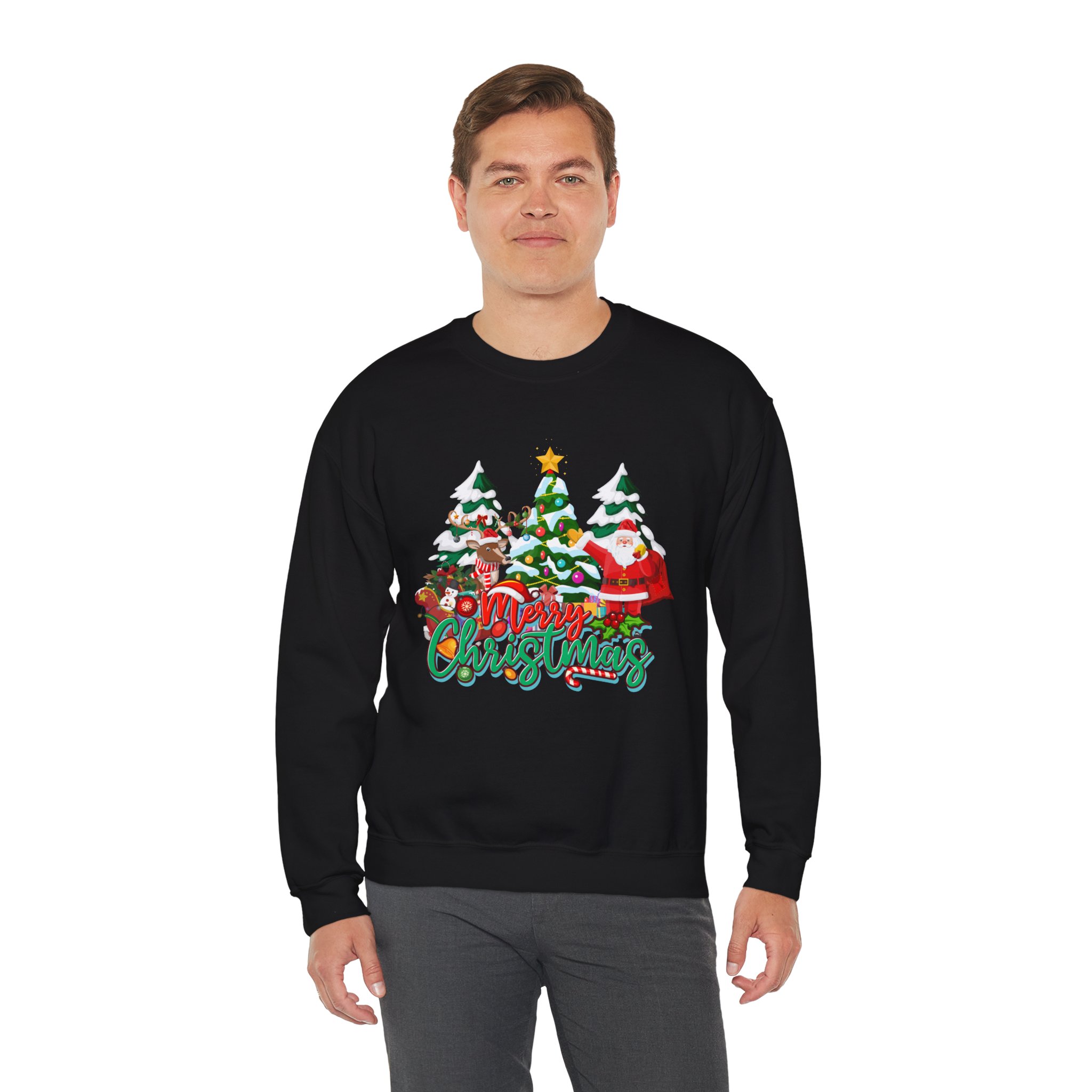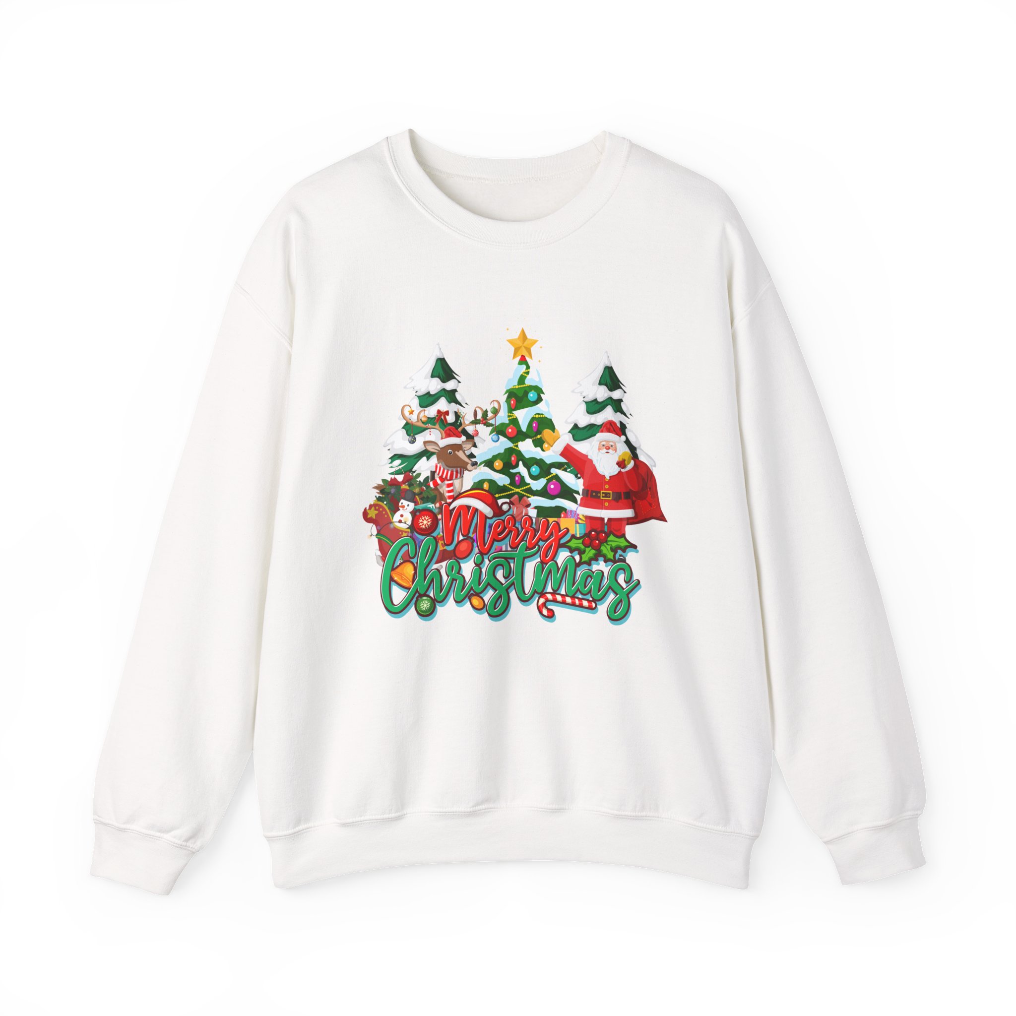 Soft, cozy, and playfully festive — this crewneck sweatshirt brings the warmth of a small-town holiday parade to chilly mornings. The clean white backdrop makes the colorful embroidered scene pop: evergreen trees dusted with snow, cheerful characters, and hand-lettered holiday script that reads like a familiar carol. It wears like a lived-in favorite thanks to a medium-heavy cotton-poly blend and a classic crew fit that sits comfortably over layers. Durable double-needle stitching and a tear-away label keep it easy to care for and comfortable against skin. Slip it on for tree-lighting nights, casual holiday visits, or slow mornings with cocoa — it settles into the rhythm of the season without shouting for attention.