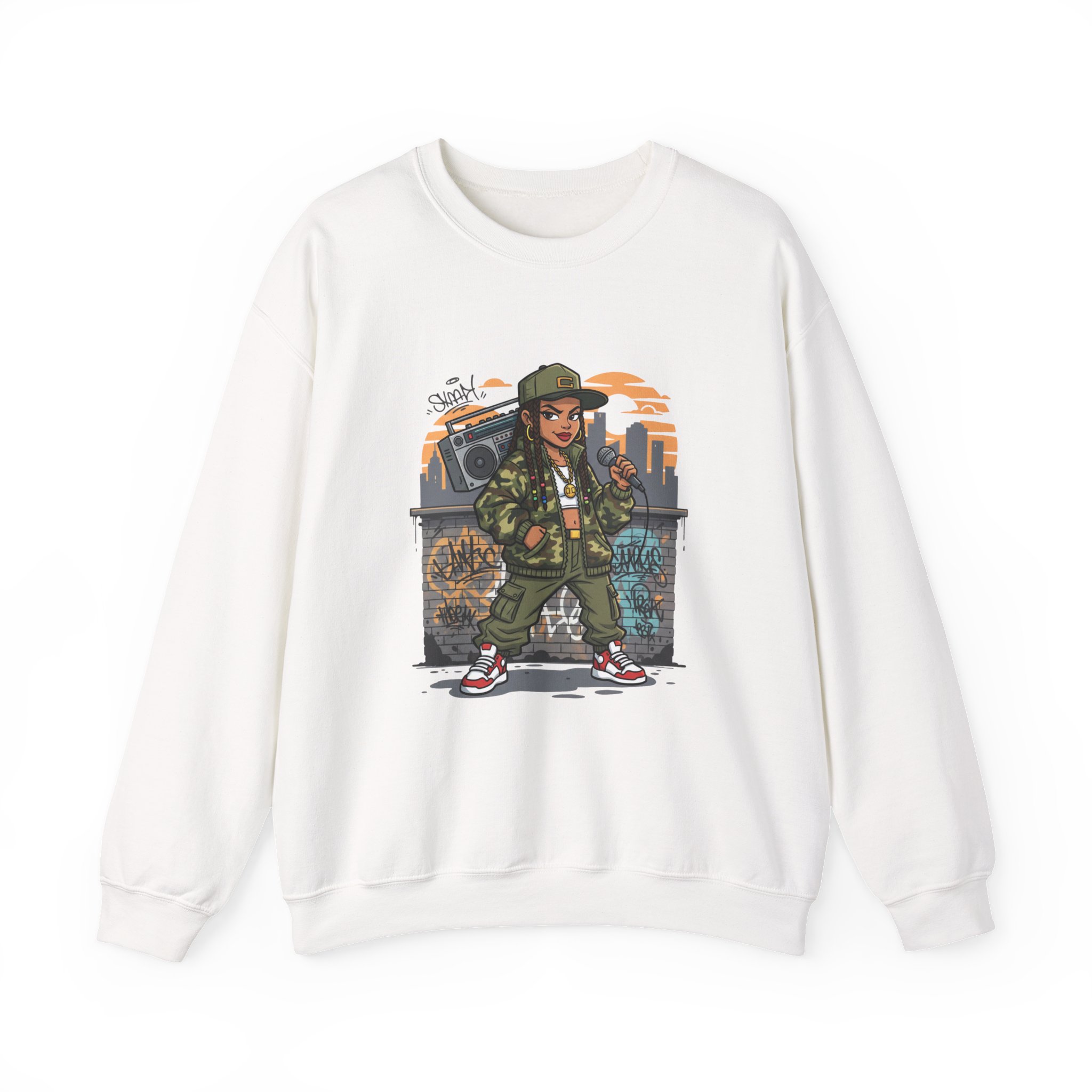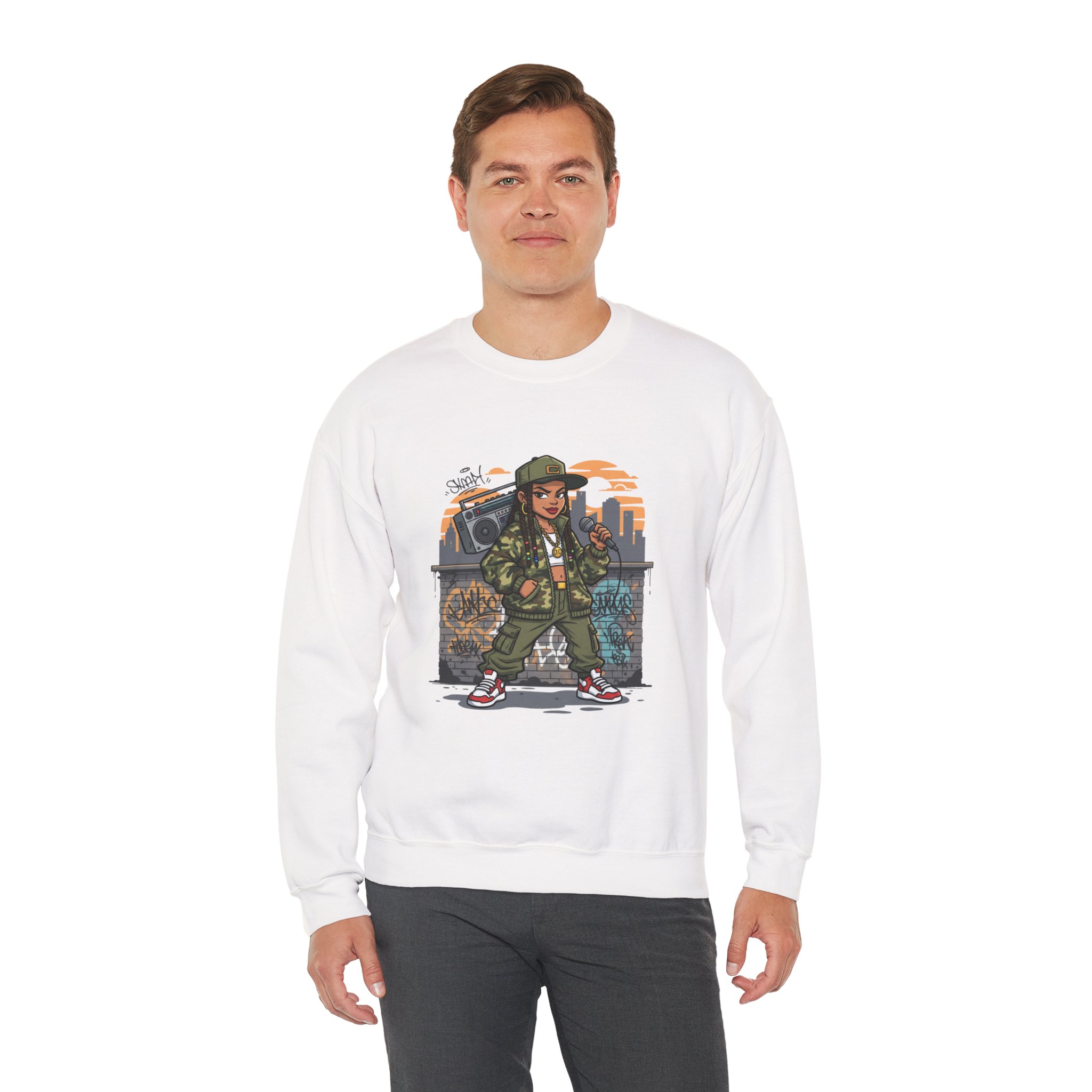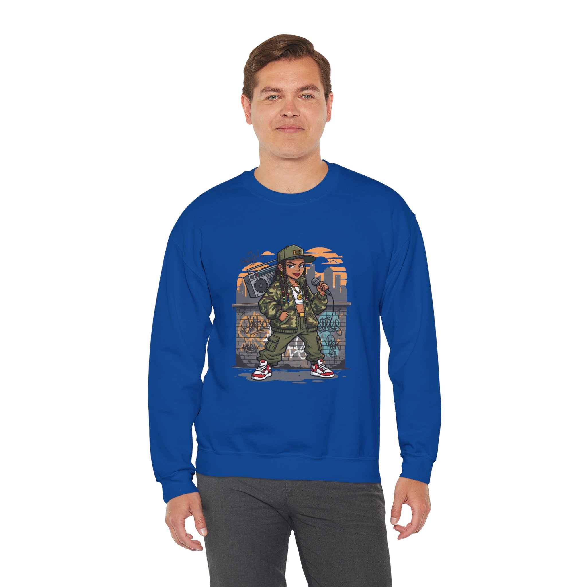 This cozy crewneck carries city-edge style with a soft, lived-in feel. The midweight cotton-poly blend keeps warmth without weighing you down, while the clean crew neckline and classic fit create a relaxed silhouette that layers easily over tees or under jackets. The front features a vibrant urban illustration—an expressive character in camo with a boombox and graffiti backdrop—so the sweatshirt reads like wearable street art. Details like double-needle stitching, a pearlized tear-away label, and OEKO-TEX–safe dyes signal quality you can feel. Wear it on cool mornings, at late-night shows, or whenever you want to bring bold, streetwise personality to your day.