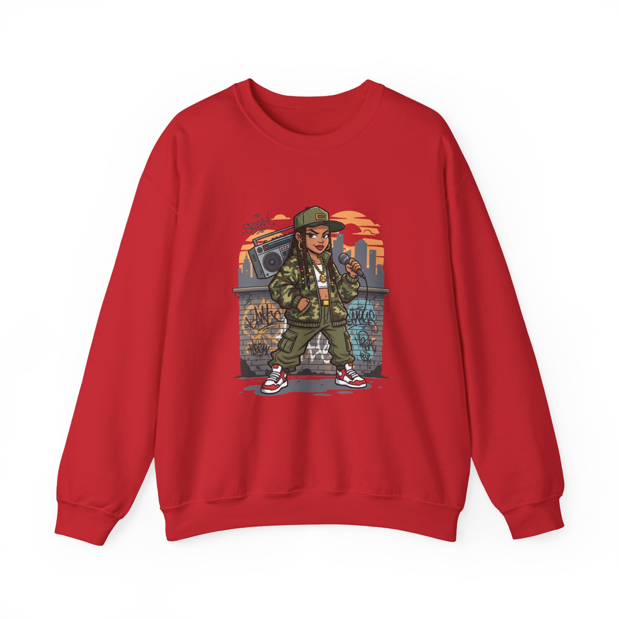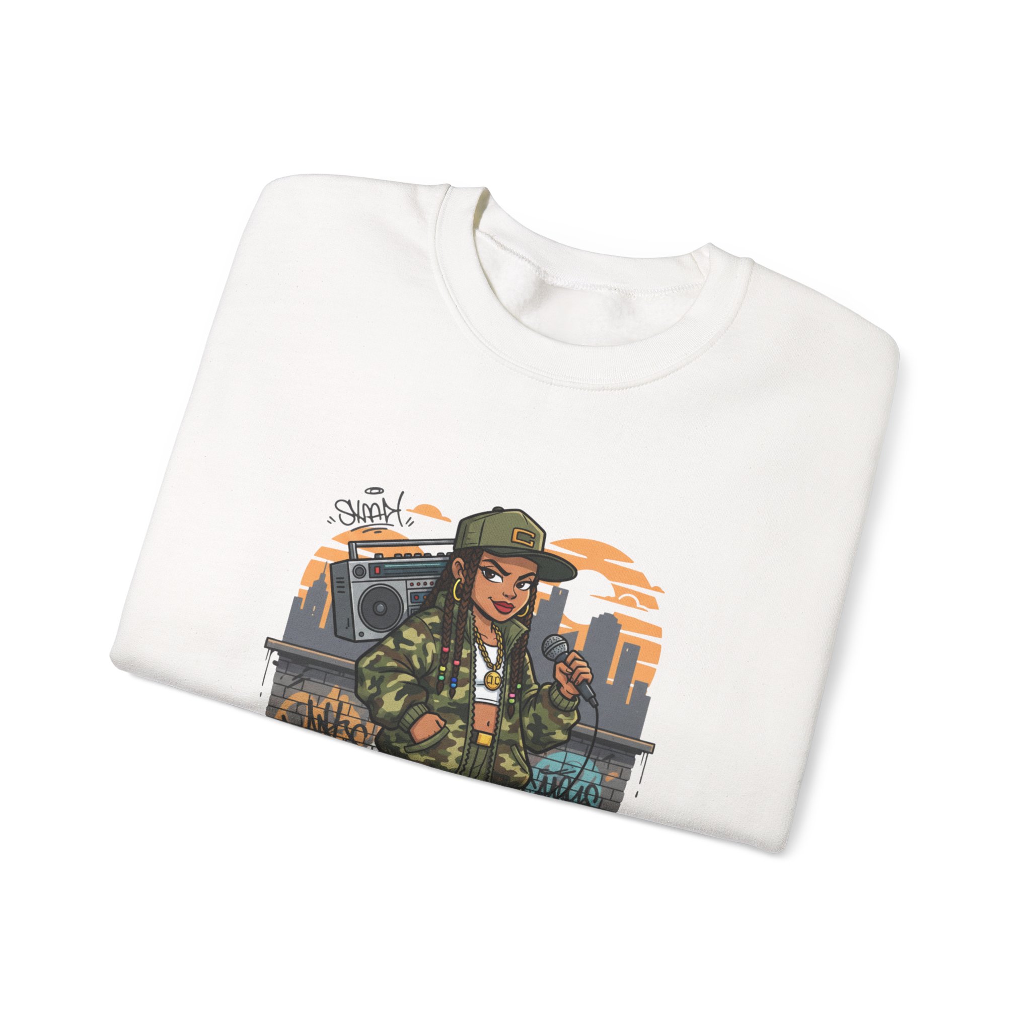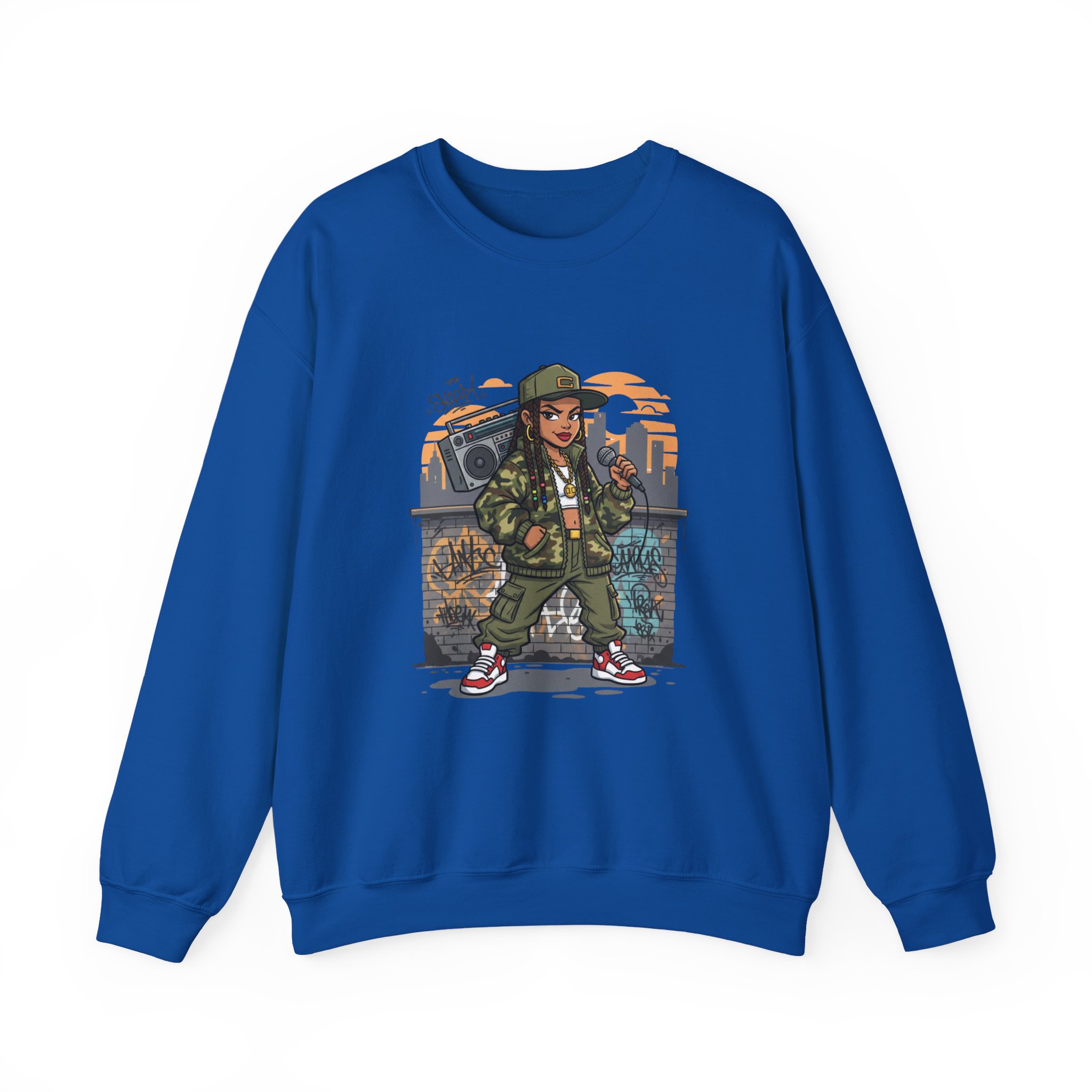 This cozy crewneck carries city-edge style with a soft, lived-in feel. The midweight cotton-poly blend keeps warmth without weighing you down, while the clean crew neckline and classic fit create a relaxed silhouette that layers easily over tees or under jackets. The front features a vibrant urban illustration—an expressive character in camo with a boombox and graffiti backdrop—so the sweatshirt reads like wearable street art. Details like double-needle stitching, a pearlized tear-away label, and OEKO-TEX–safe dyes signal quality you can feel. Wear it on cool mornings, at late-night shows, or whenever you want to bring bold, streetwise personality to your day.