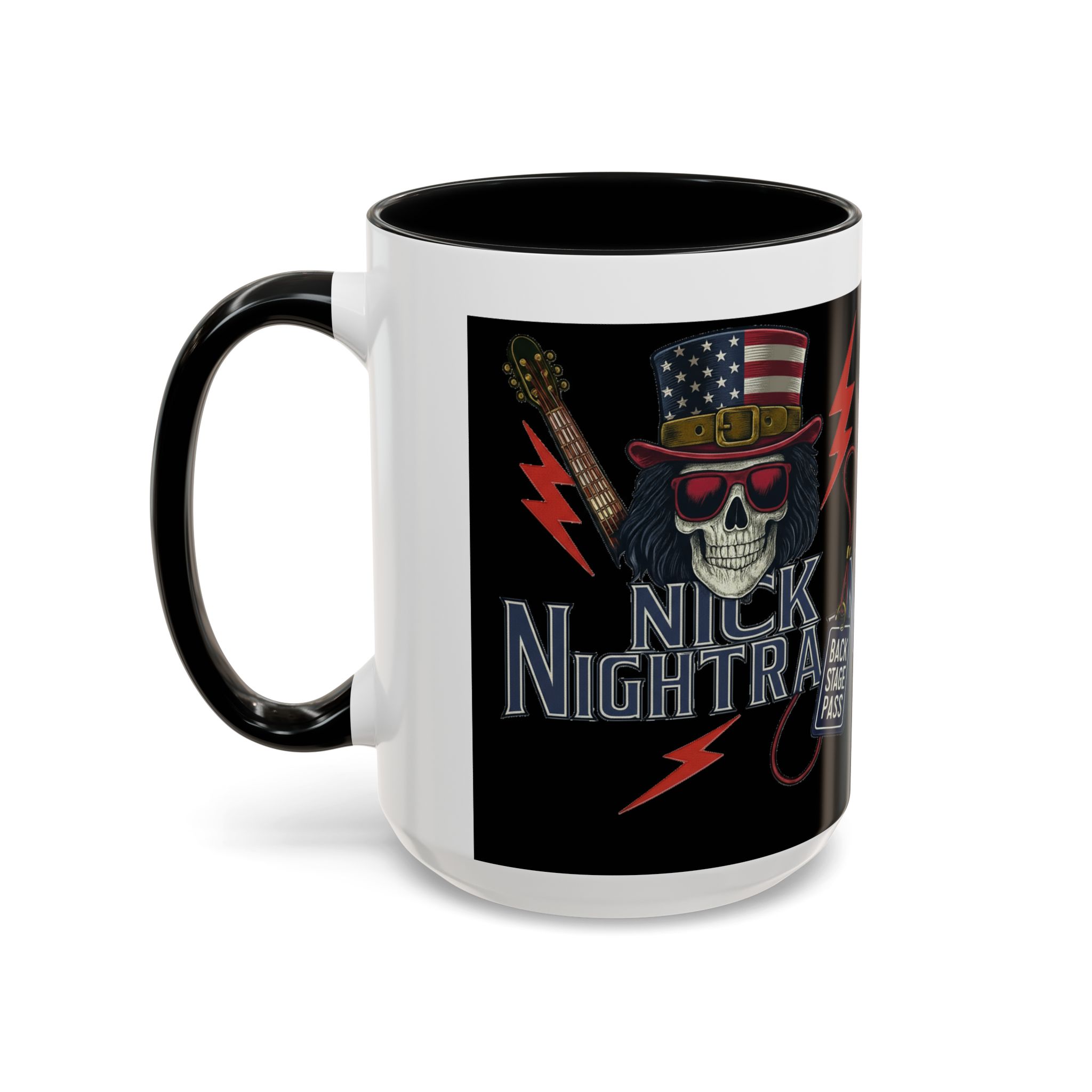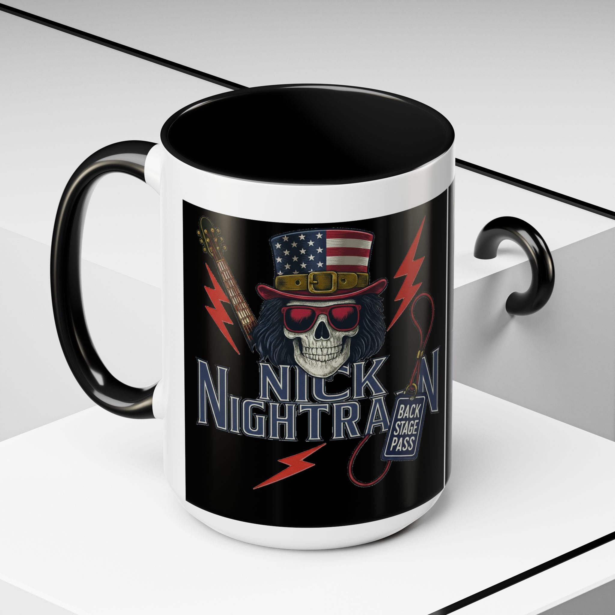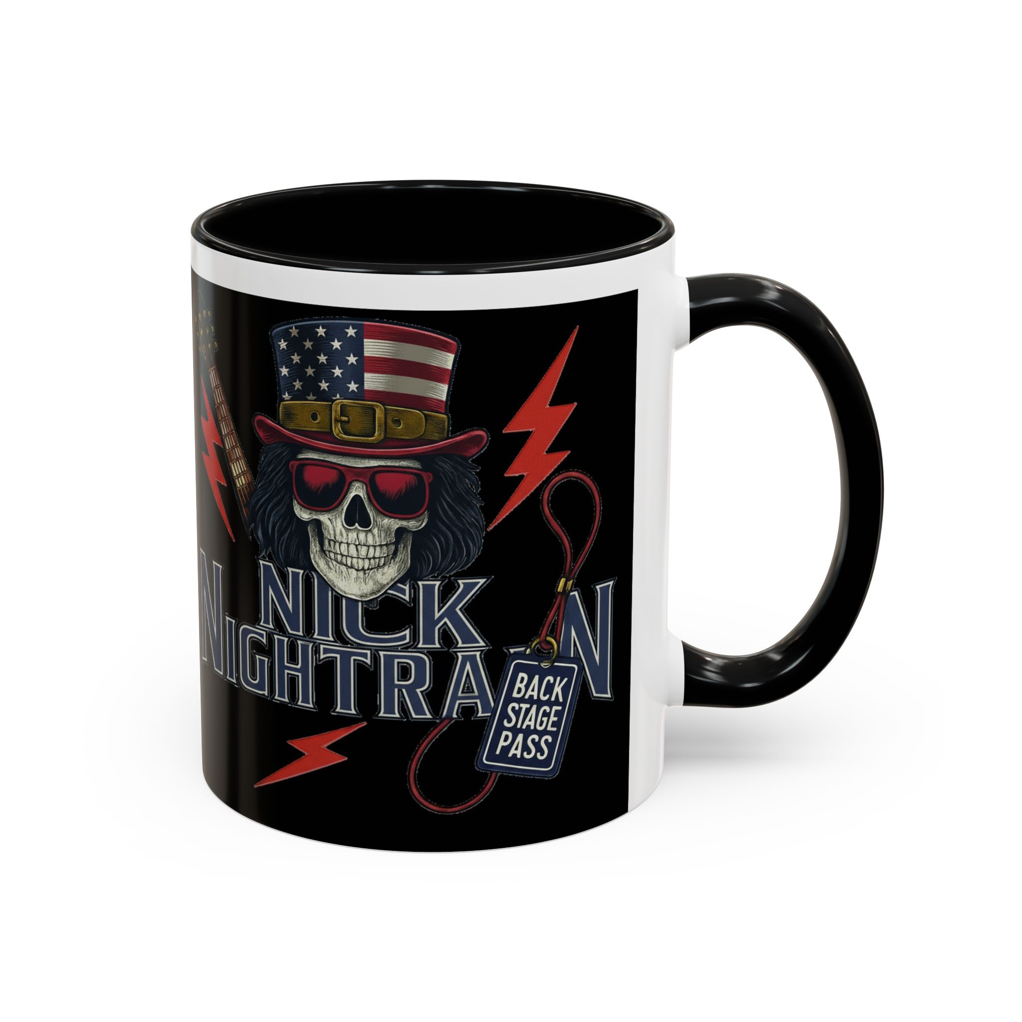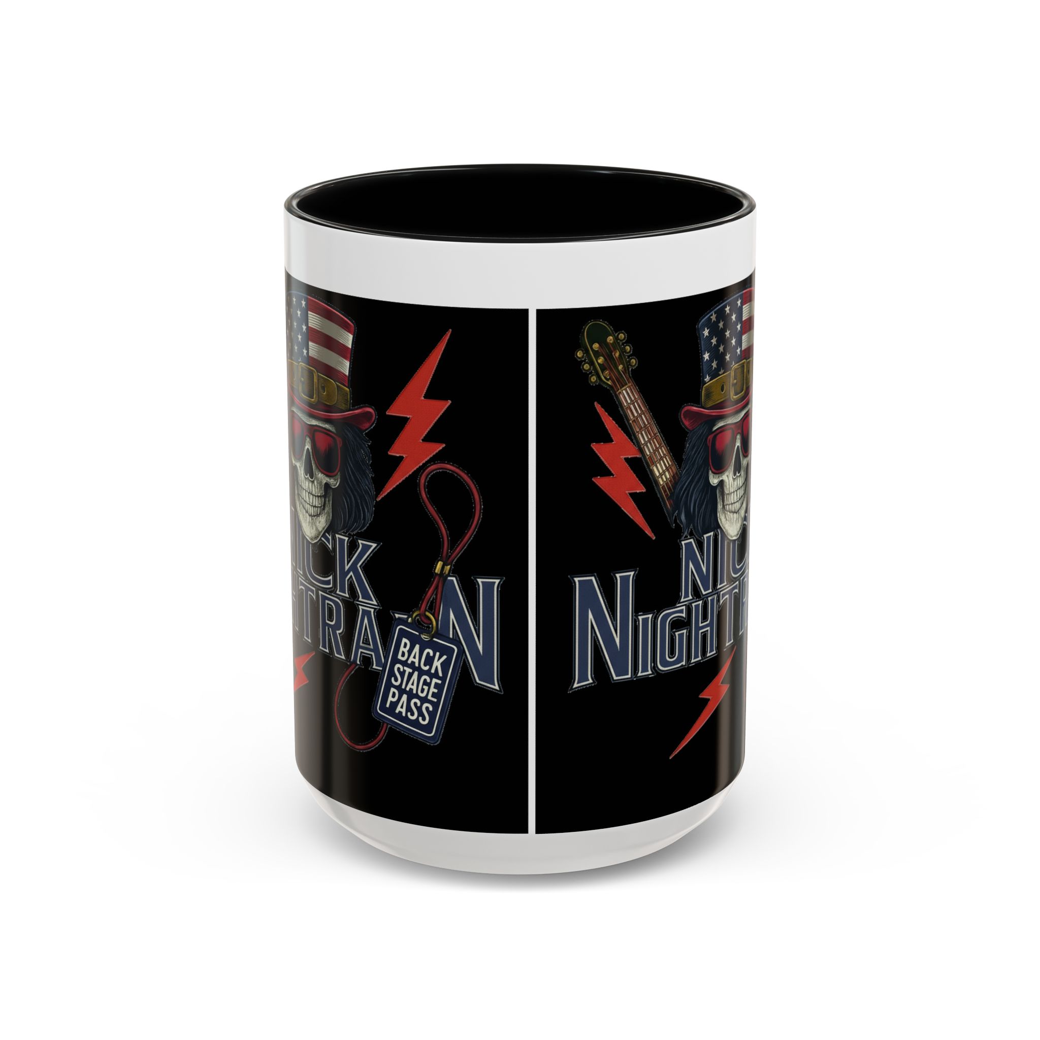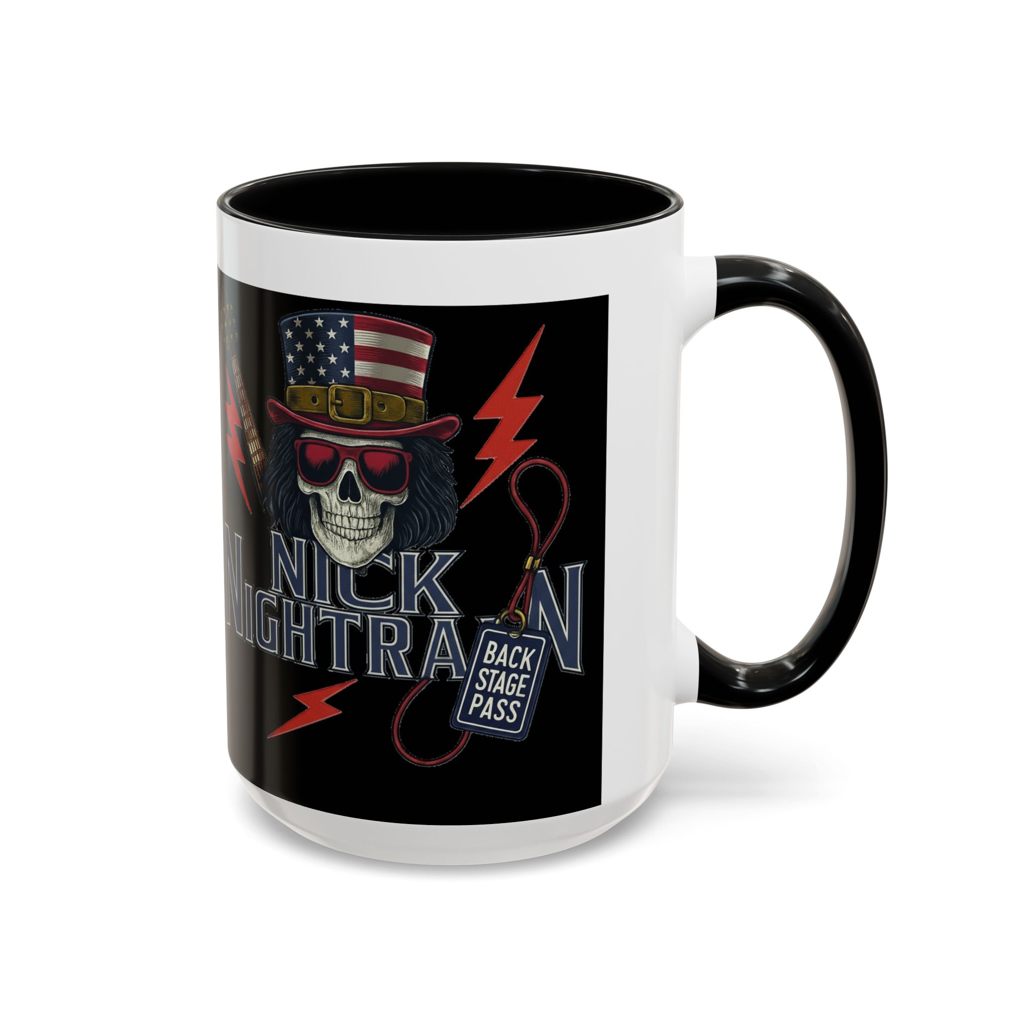 This ceramic accent mug brings full-throttle rock energy to your morning ritual. A bold skull wearing an American-flag top hat, red shades, and a backstage pass graphic wrap around the glossy black canvas, so every sip feels like the first chord of a live set. The colored interior and handle add punchy contrast, while vibrant print quality keeps the design sharp and electric through everyday use. It’s the kind of mug you reach for when you want a little attitude with your coffee — whether you’re cueing up a road-trip playlist, reminiscing about last night’s show, or gearing up for a rehearsal.