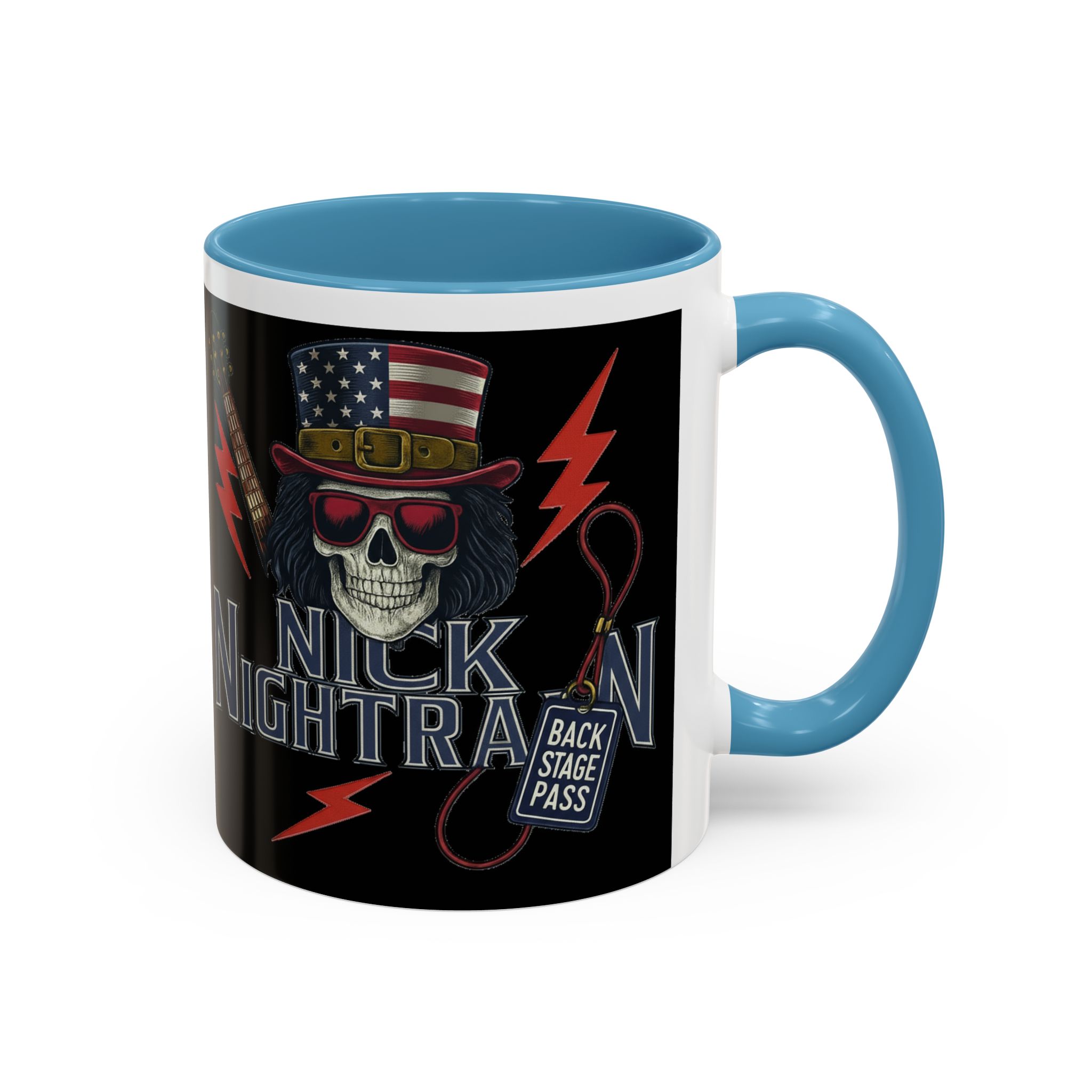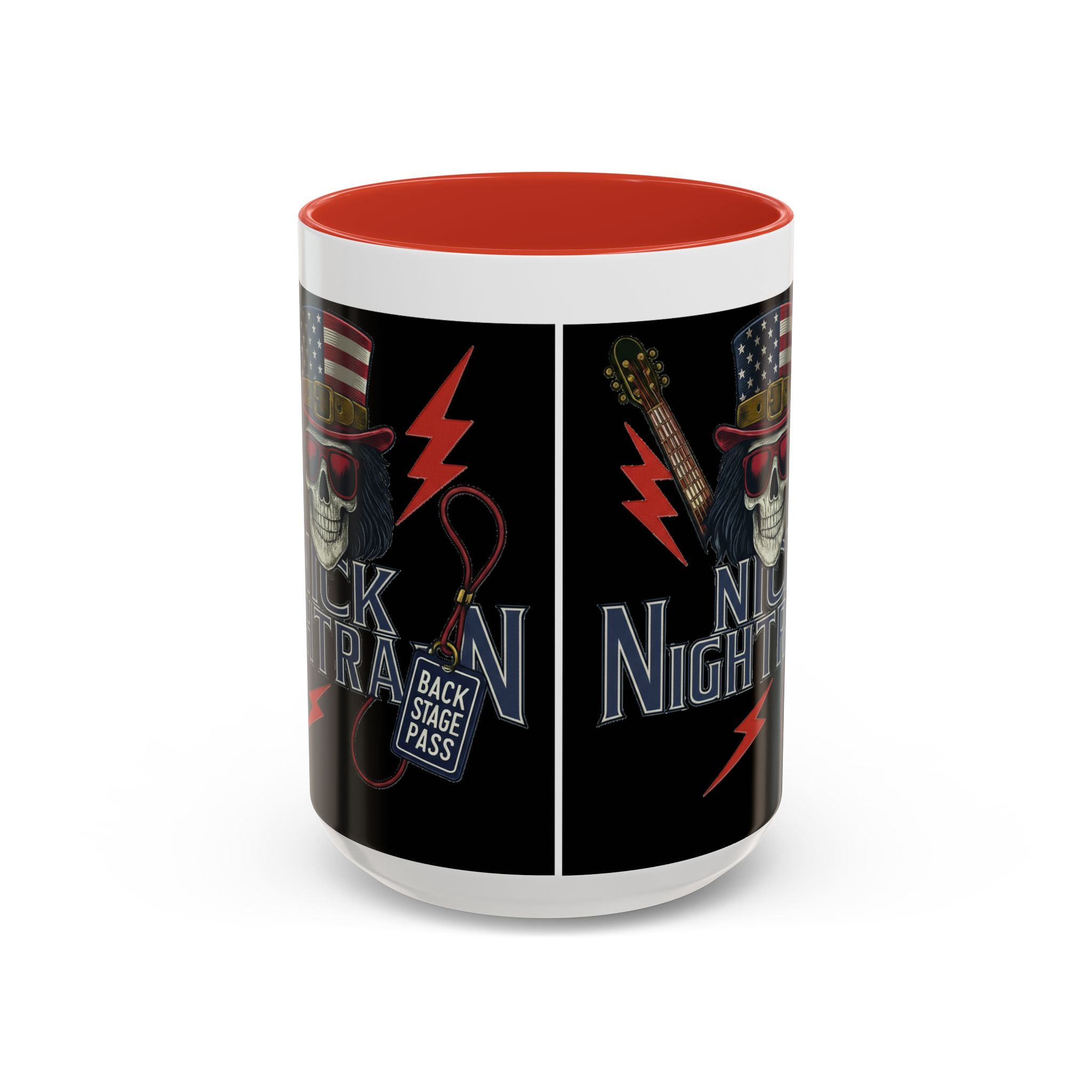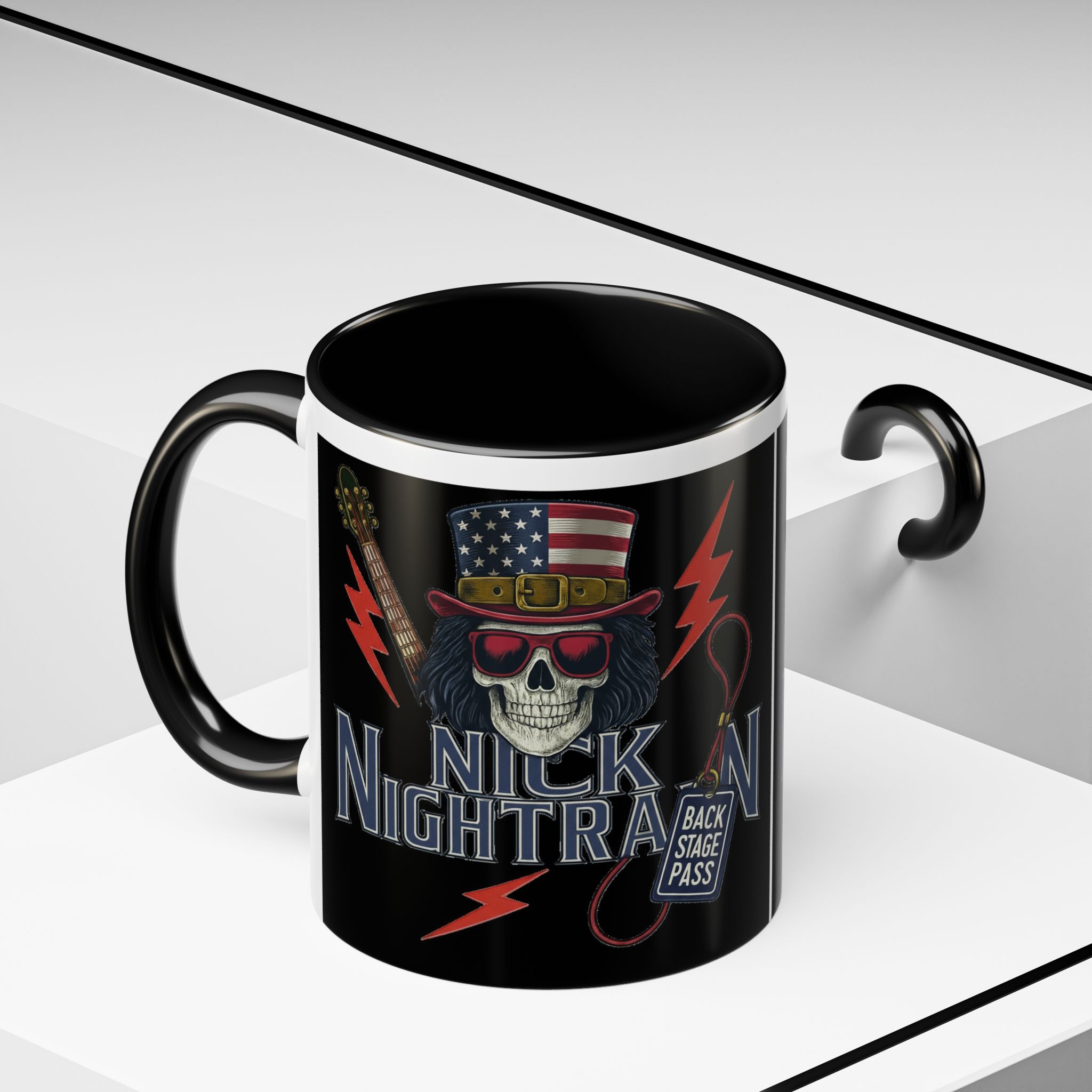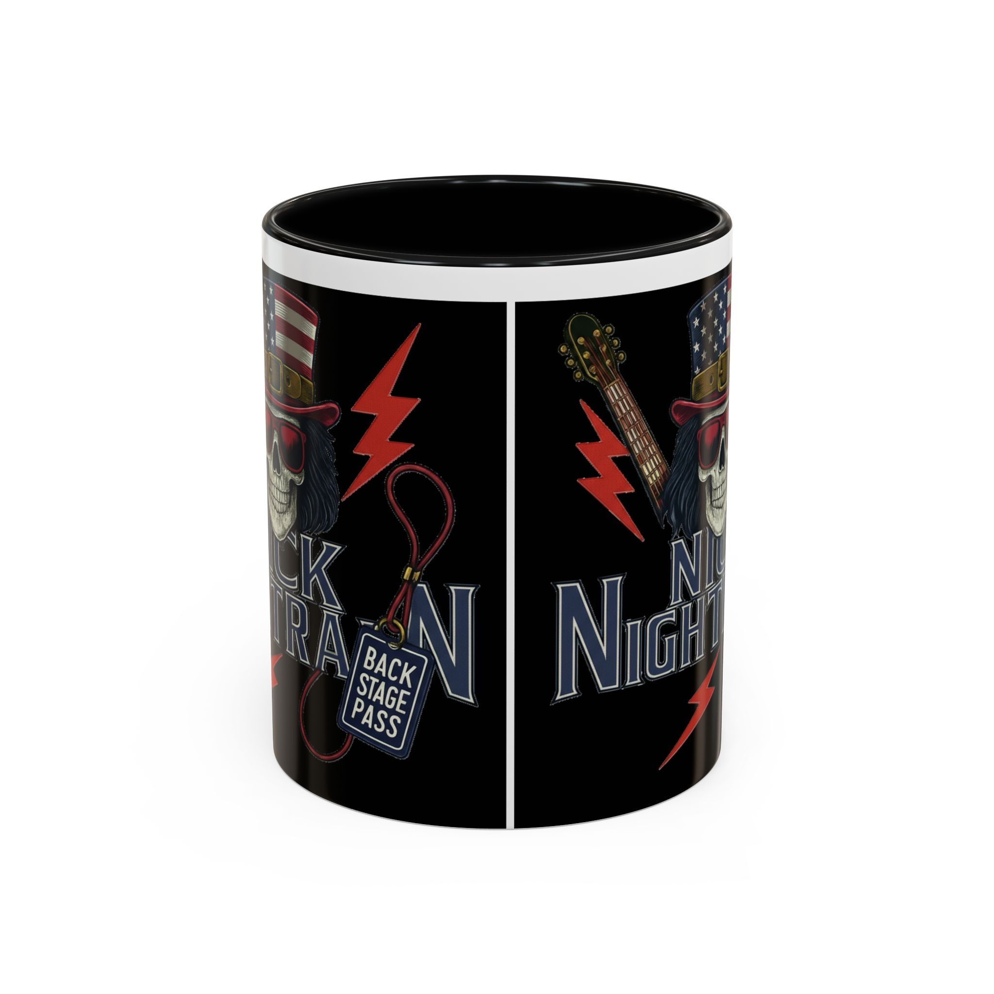 This ceramic accent mug brings full-throttle rock energy to your morning ritual. A bold skull wearing an American-flag top hat, red shades, and a backstage pass graphic wrap around the glossy black canvas, so every sip feels like the first chord of a live set. The colored interior and handle add punchy contrast, while vibrant print quality keeps the design sharp and electric through everyday use. It’s the kind of mug you reach for when you want a little attitude with your coffee — whether you’re cueing up a road-trip playlist, reminiscing about last night’s show, or gearing up for a rehearsal.