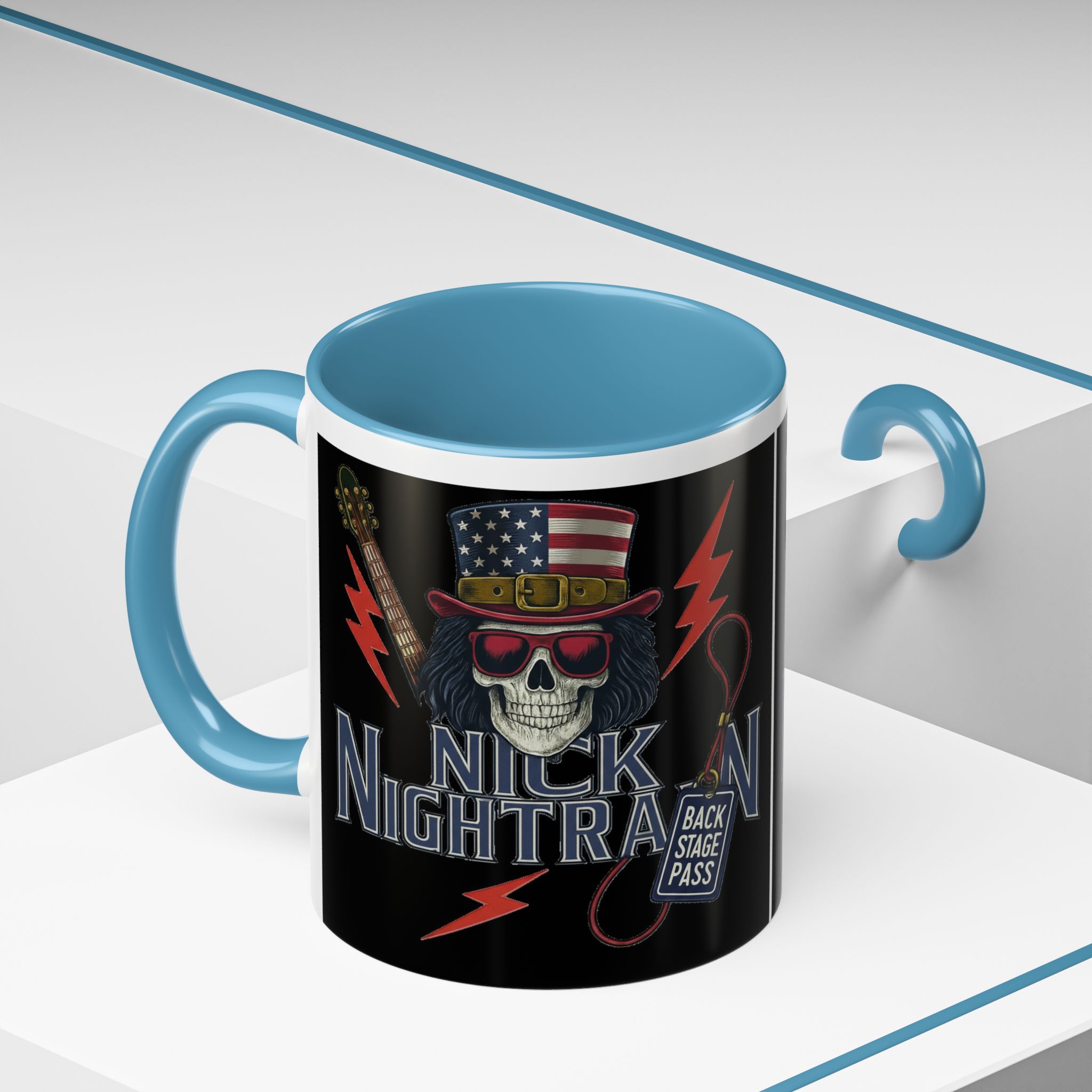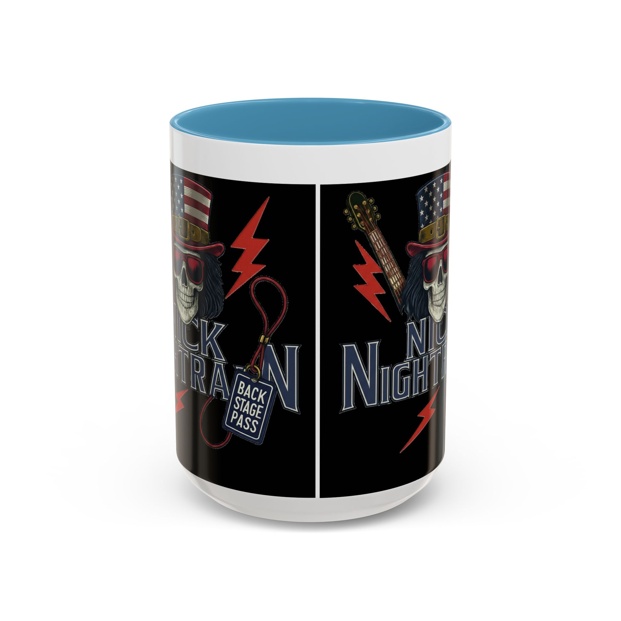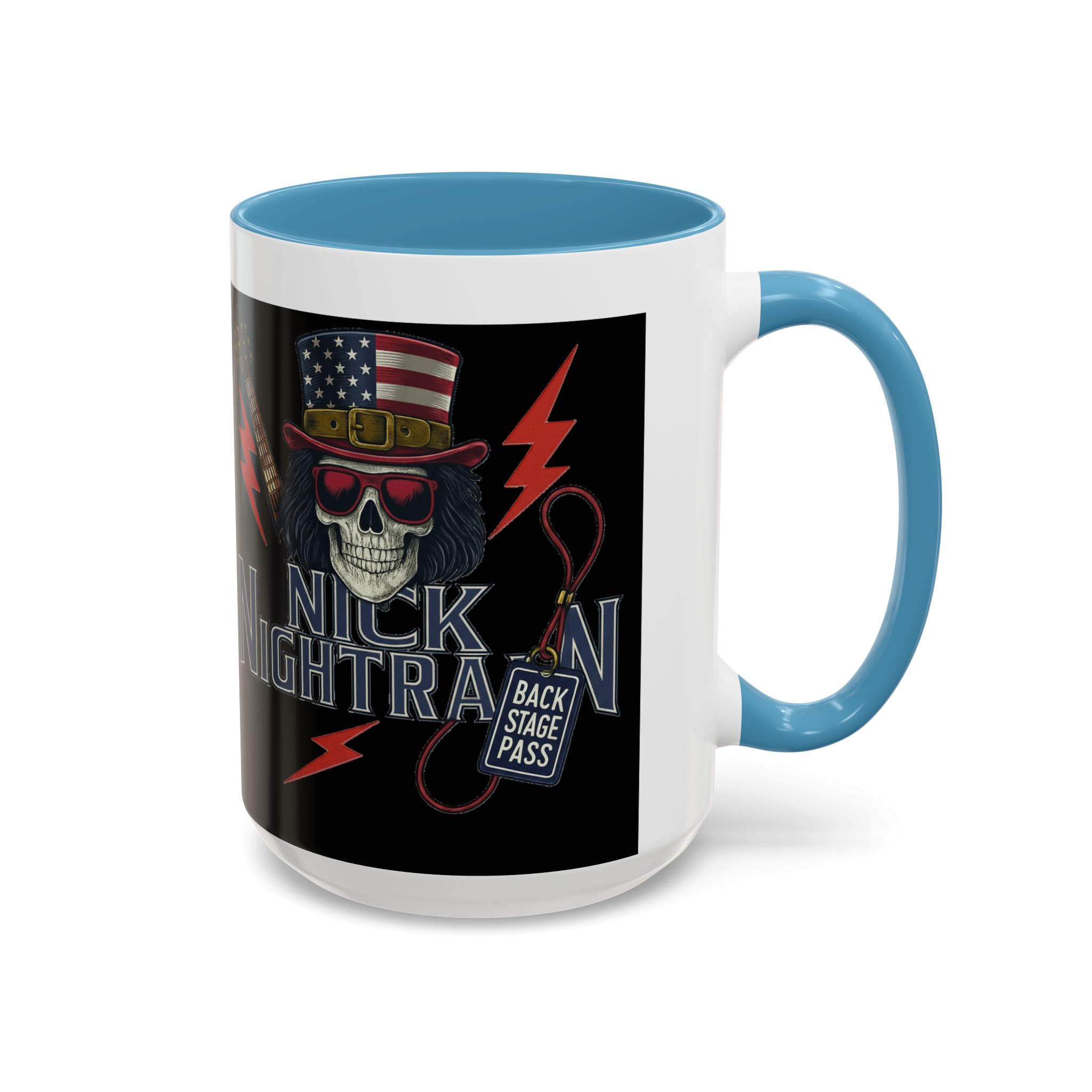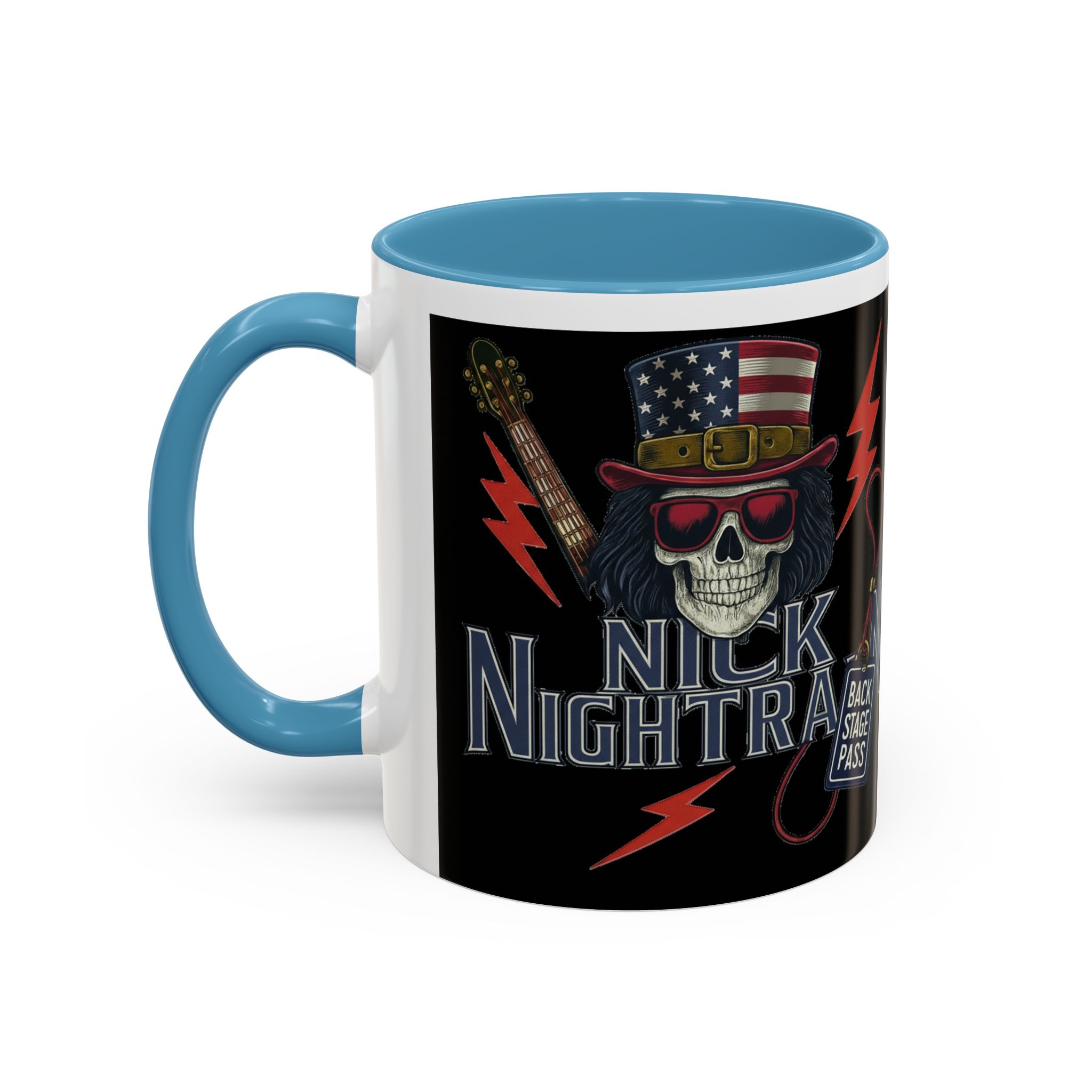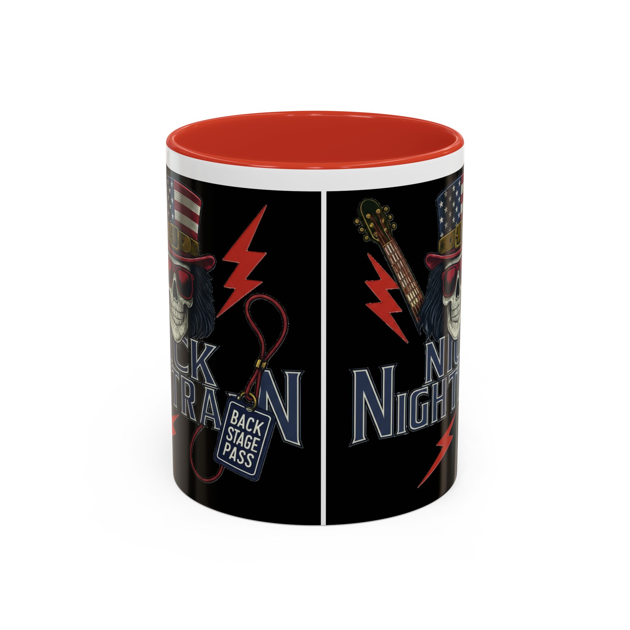 This ceramic accent mug brings full-throttle rock energy to your morning ritual. A bold skull wearing an American-flag top hat, red shades, and a backstage pass graphic wrap around the glossy black canvas, so every sip feels like the first chord of a live set. The colored interior and handle add punchy contrast, while vibrant print quality keeps the design sharp and electric through everyday use. It’s the kind of mug you reach for when you want a little attitude with your coffee — whether you’re cueing up a road-trip playlist, reminiscing about last night’s show, or gearing up for a rehearsal.