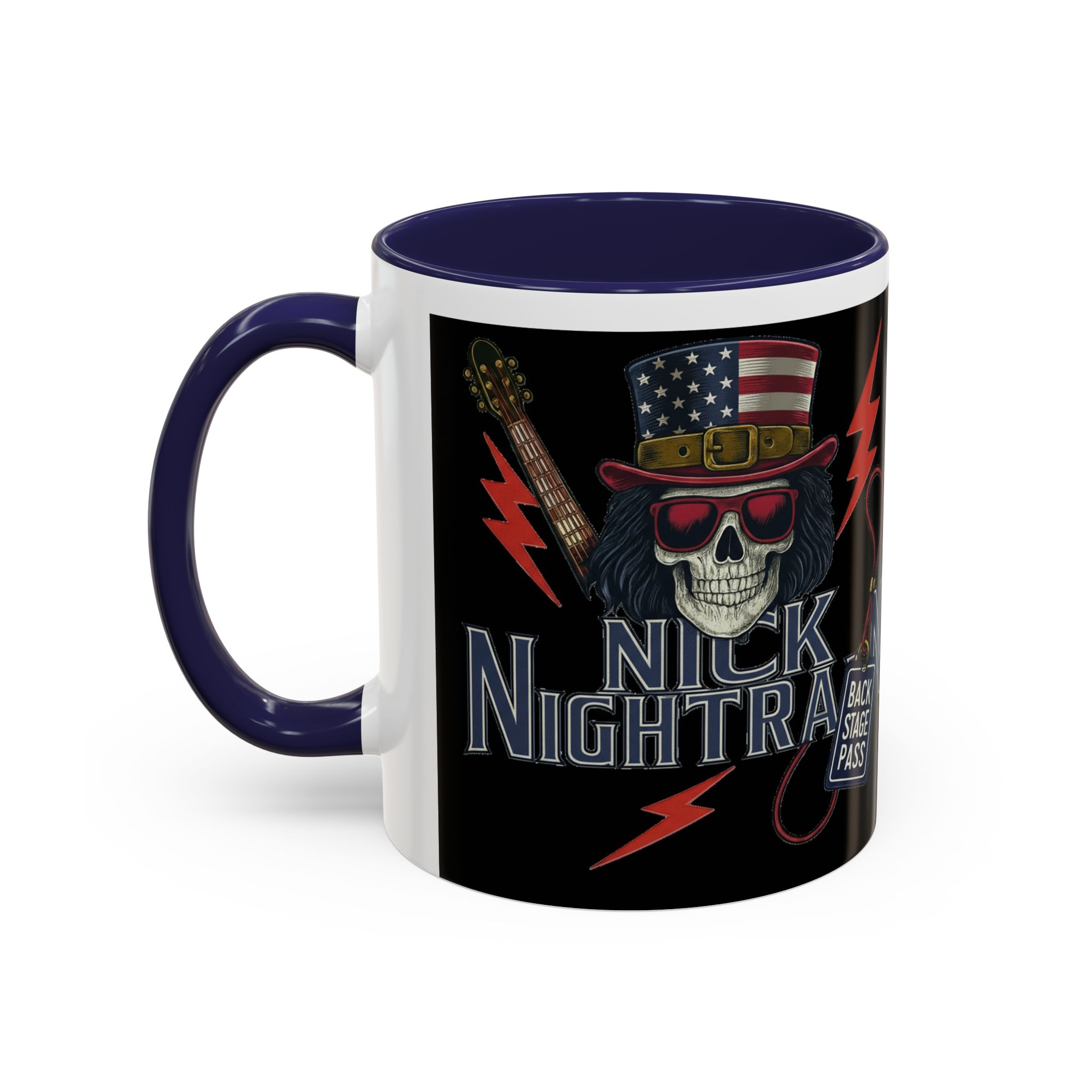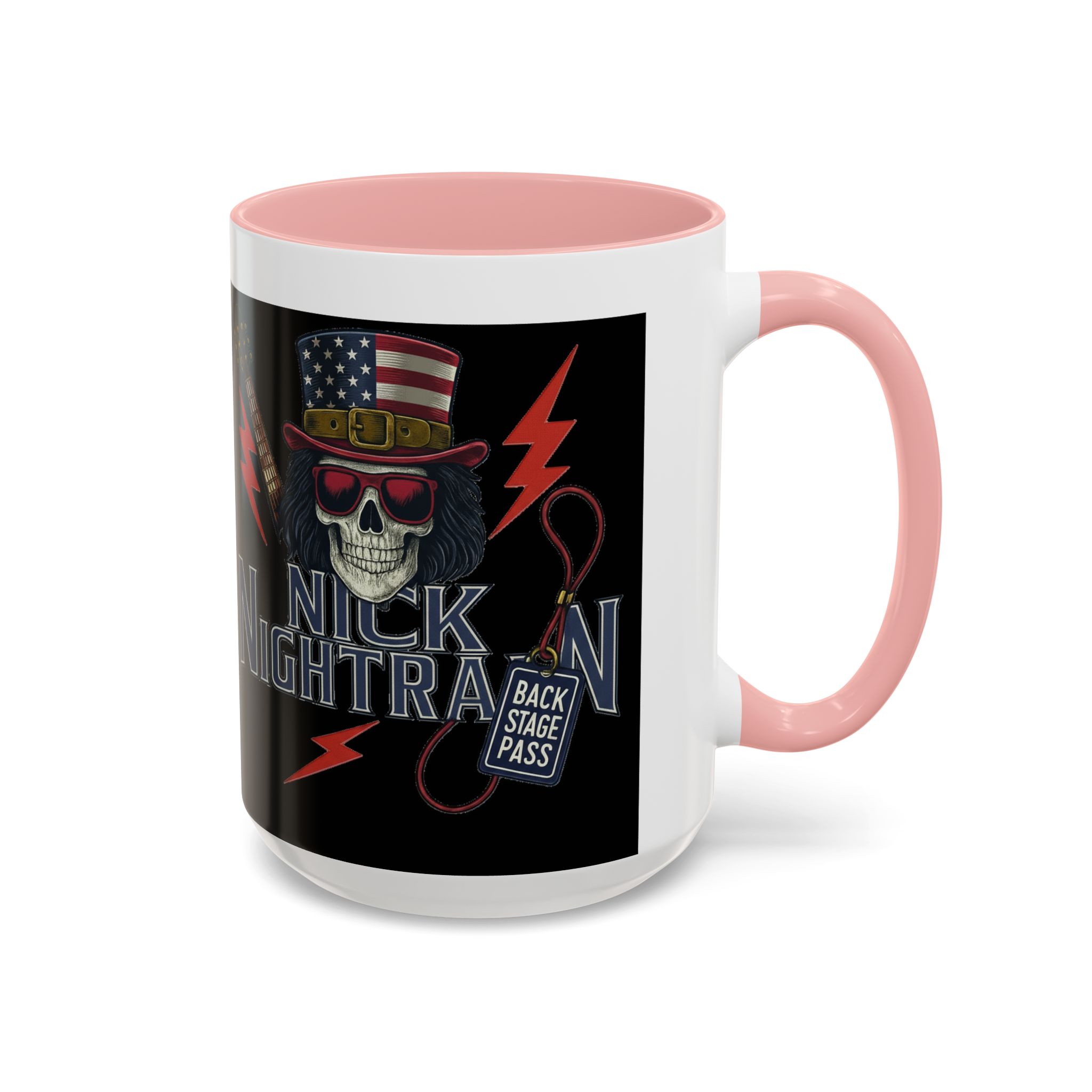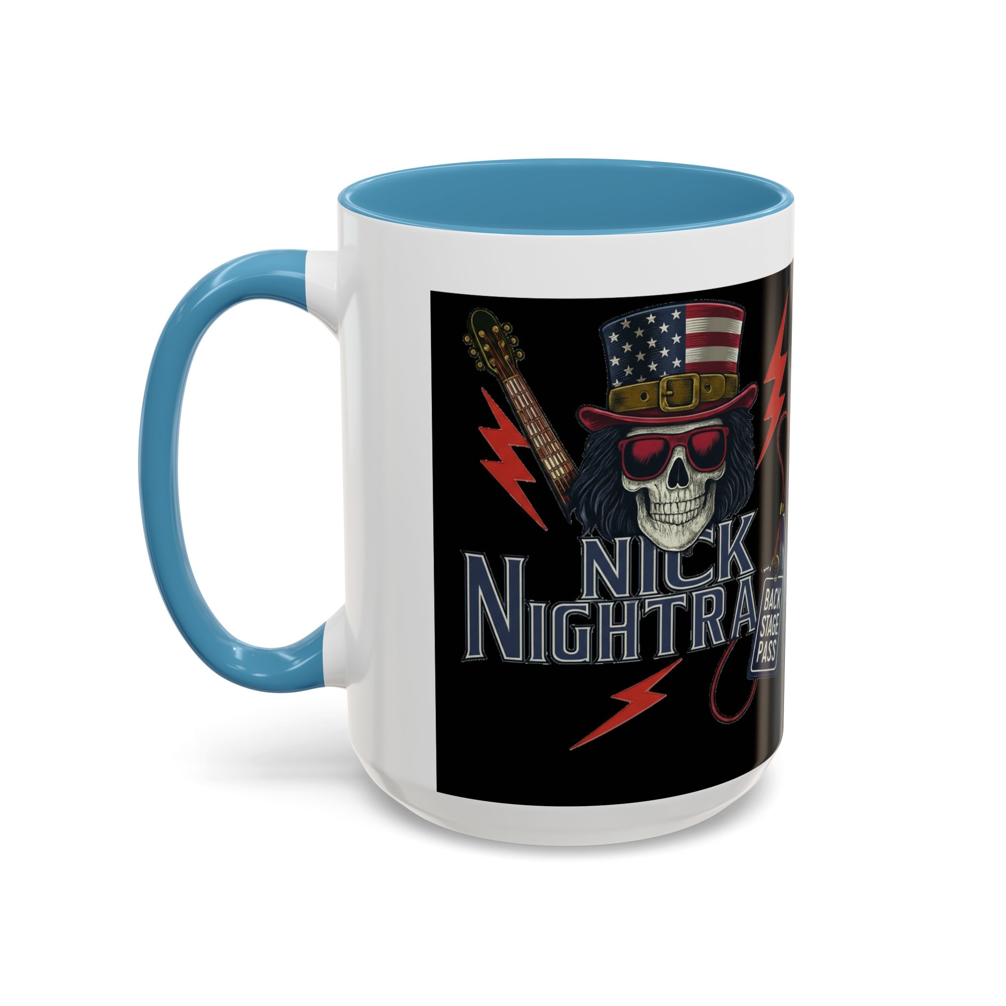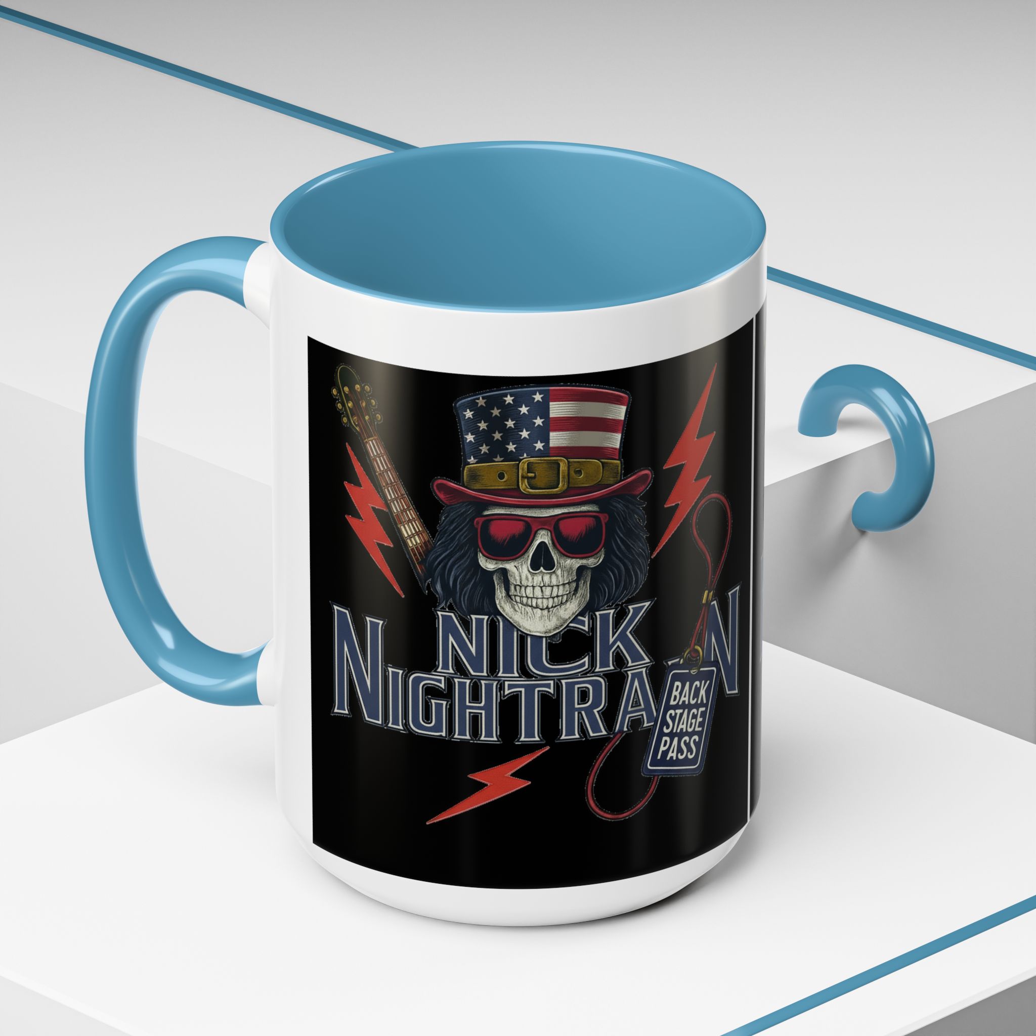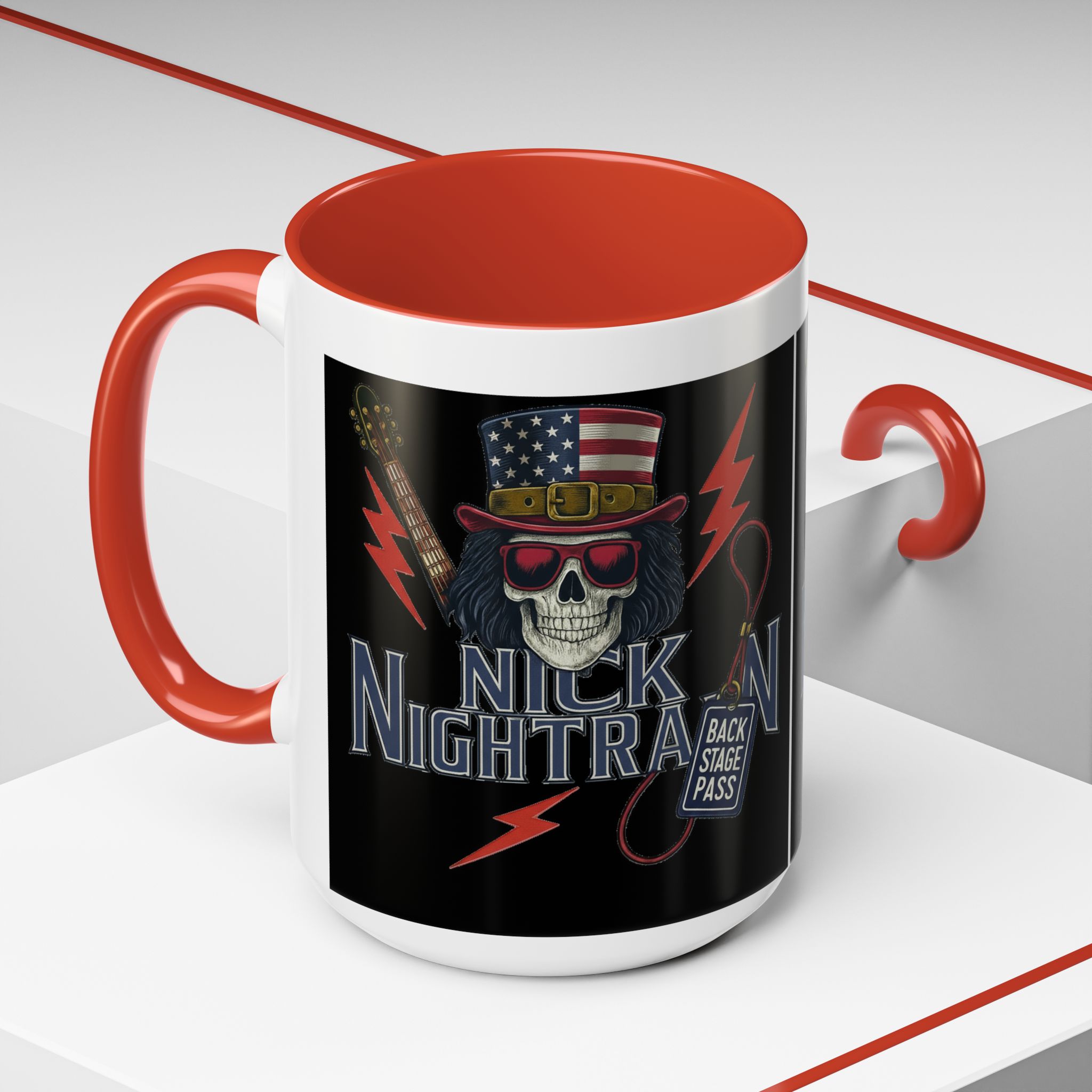 This ceramic accent mug brings full-throttle rock energy to your morning ritual. A bold skull wearing an American-flag top hat, red shades, and a backstage pass graphic wrap around the glossy black canvas, so every sip feels like the first chord of a live set. The colored interior and handle add punchy contrast, while vibrant print quality keeps the design sharp and electric through everyday use. It’s the kind of mug you reach for when you want a little attitude with your coffee — whether you’re cueing up a road-trip playlist, reminiscing about last night’s show, or gearing up for a rehearsal.