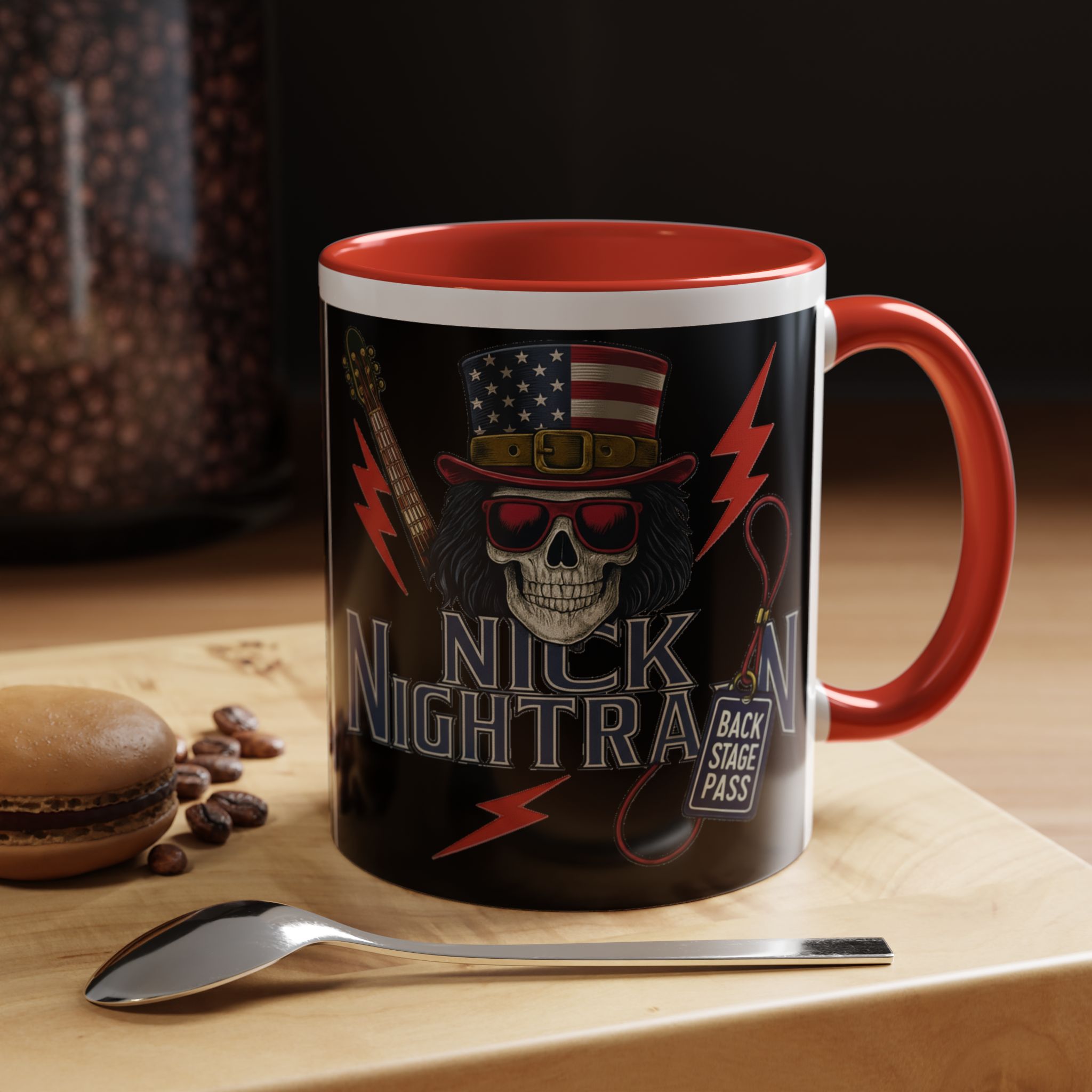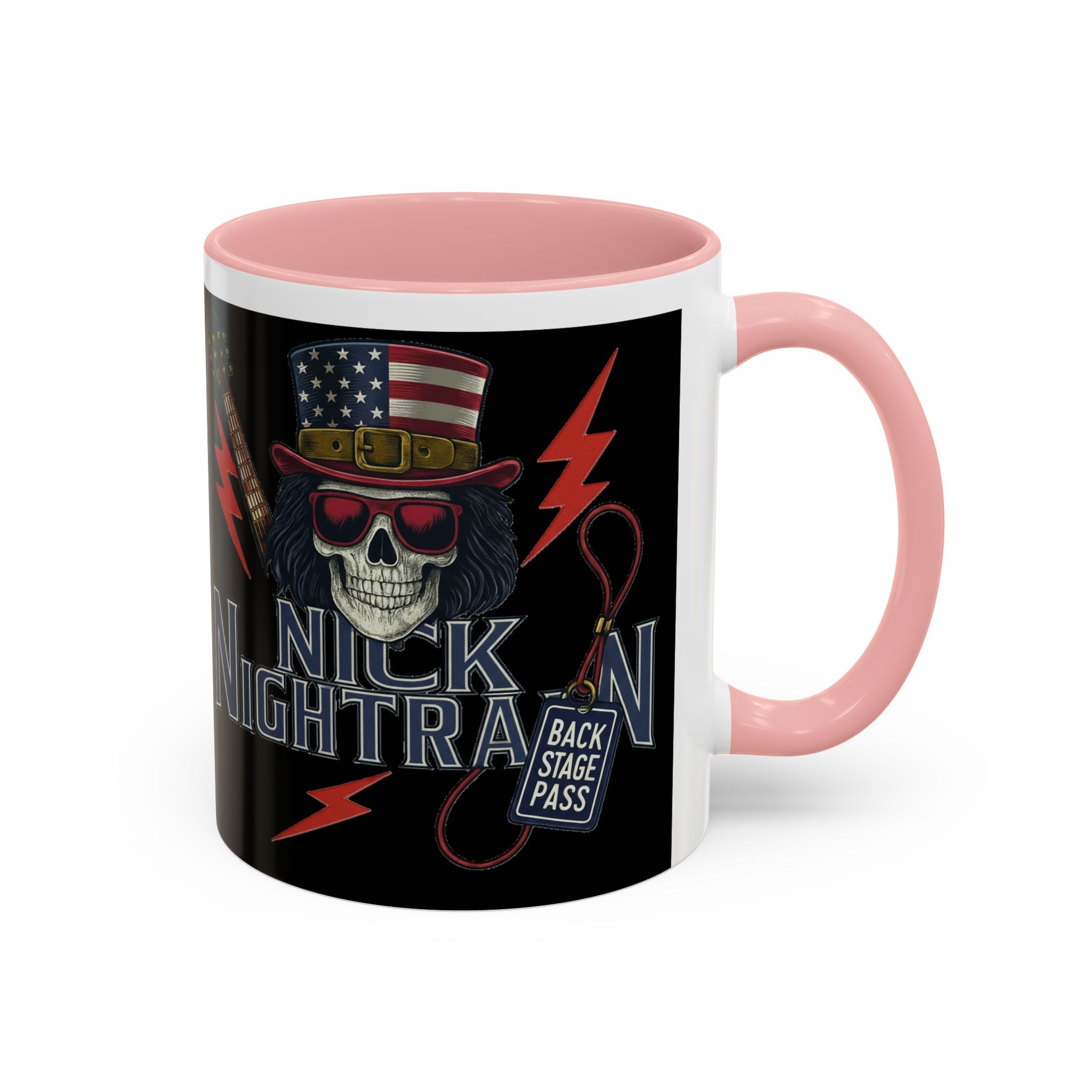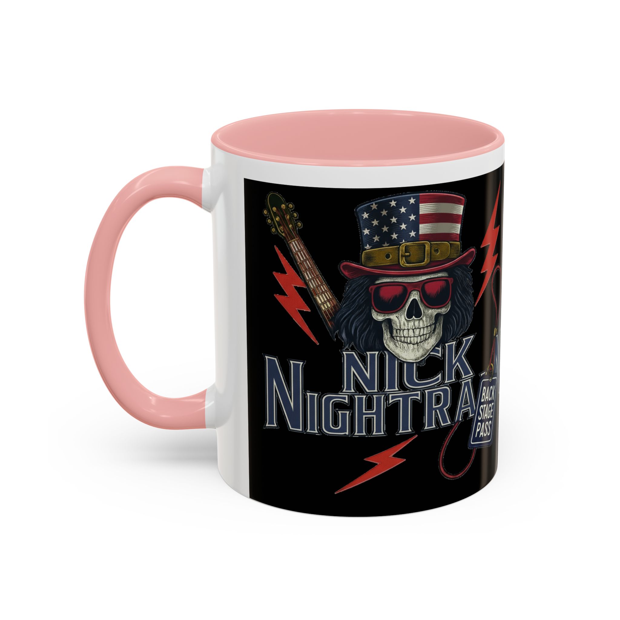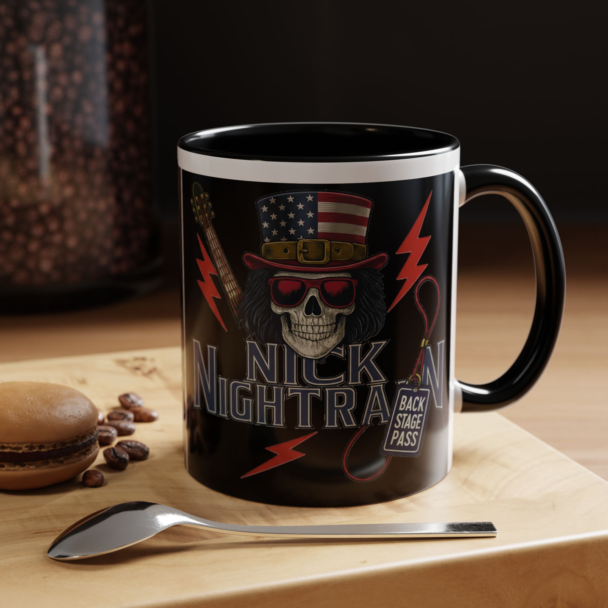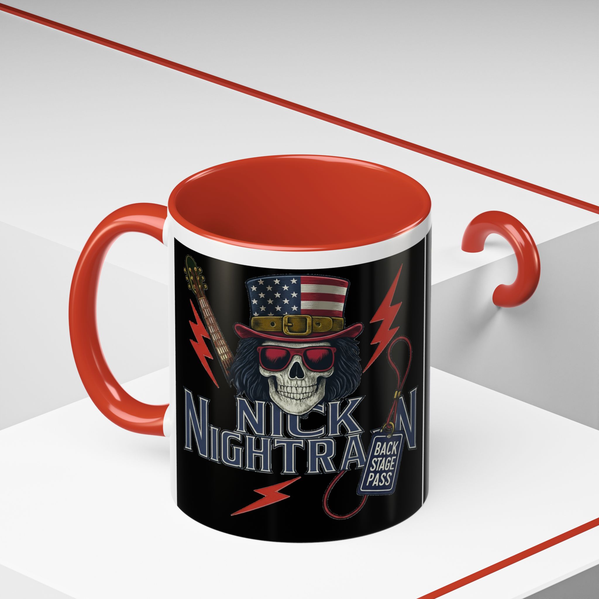 This ceramic accent mug brings full-throttle rock energy to your morning ritual. A bold skull wearing an American-flag top hat, red shades, and a backstage pass graphic wrap around the glossy black canvas, so every sip feels like the first chord of a live set. The colored interior and handle add punchy contrast, while vibrant print quality keeps the design sharp and electric through everyday use. It’s the kind of mug you reach for when you want a little attitude with your coffee — whether you’re cueing up a road-trip playlist, reminiscing about last night’s show, or gearing up for a rehearsal.