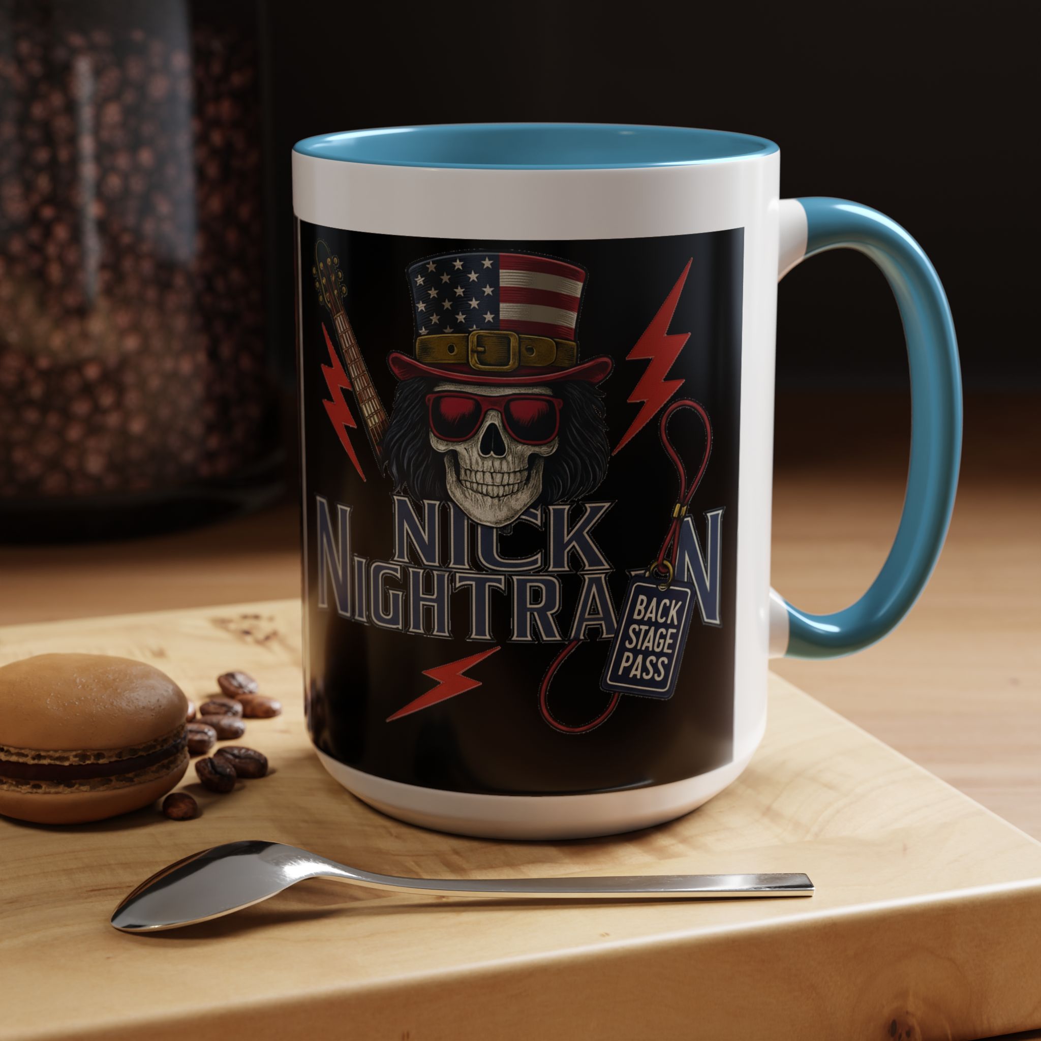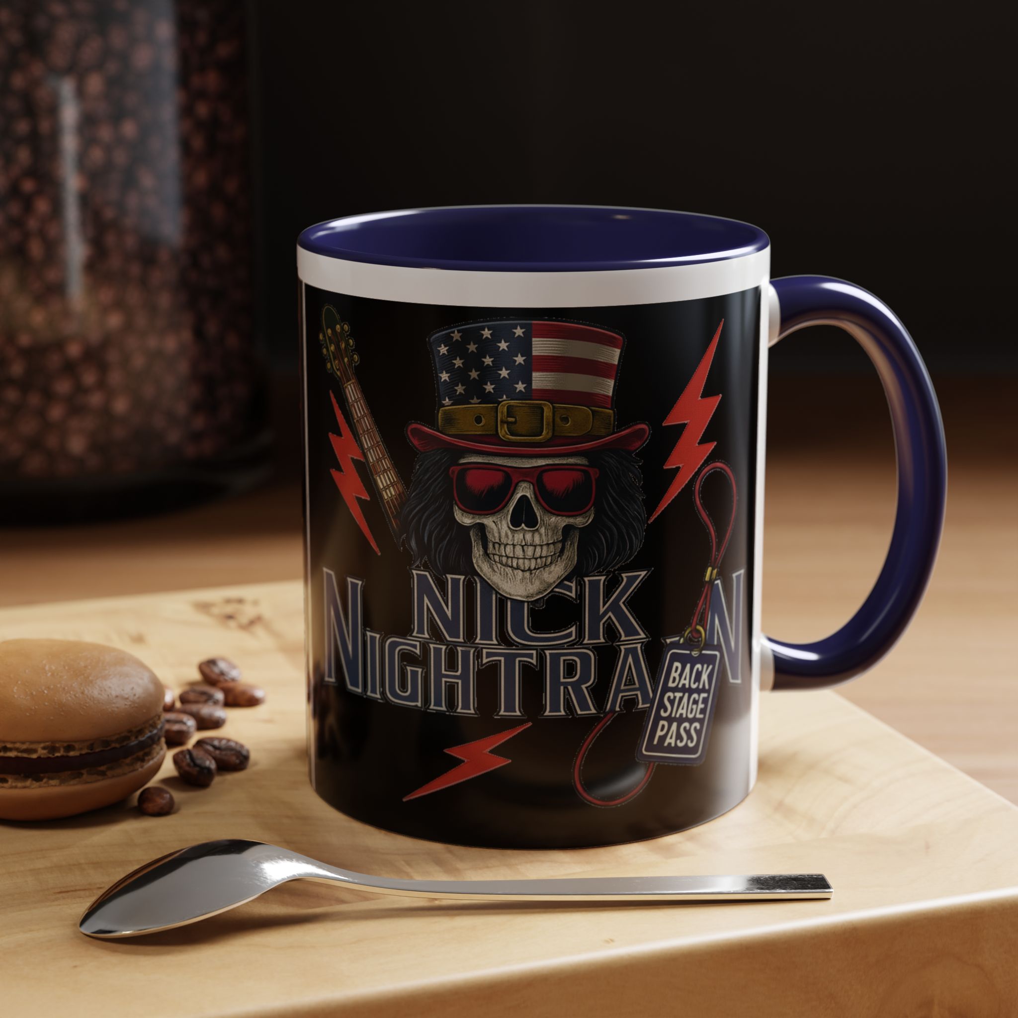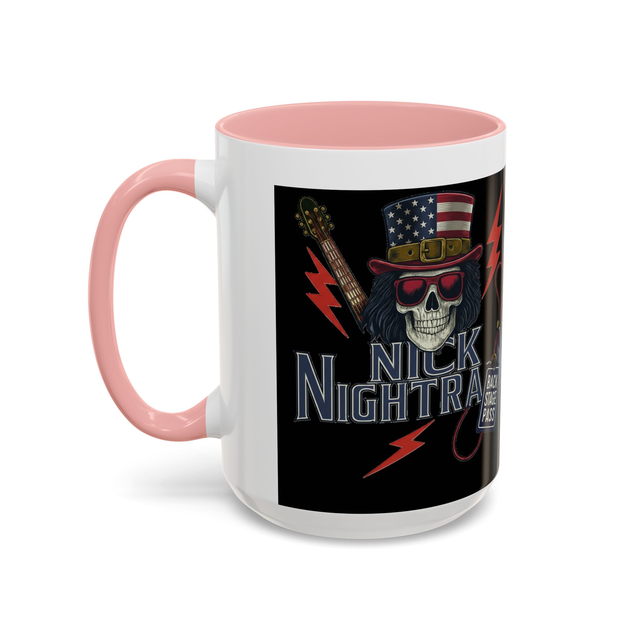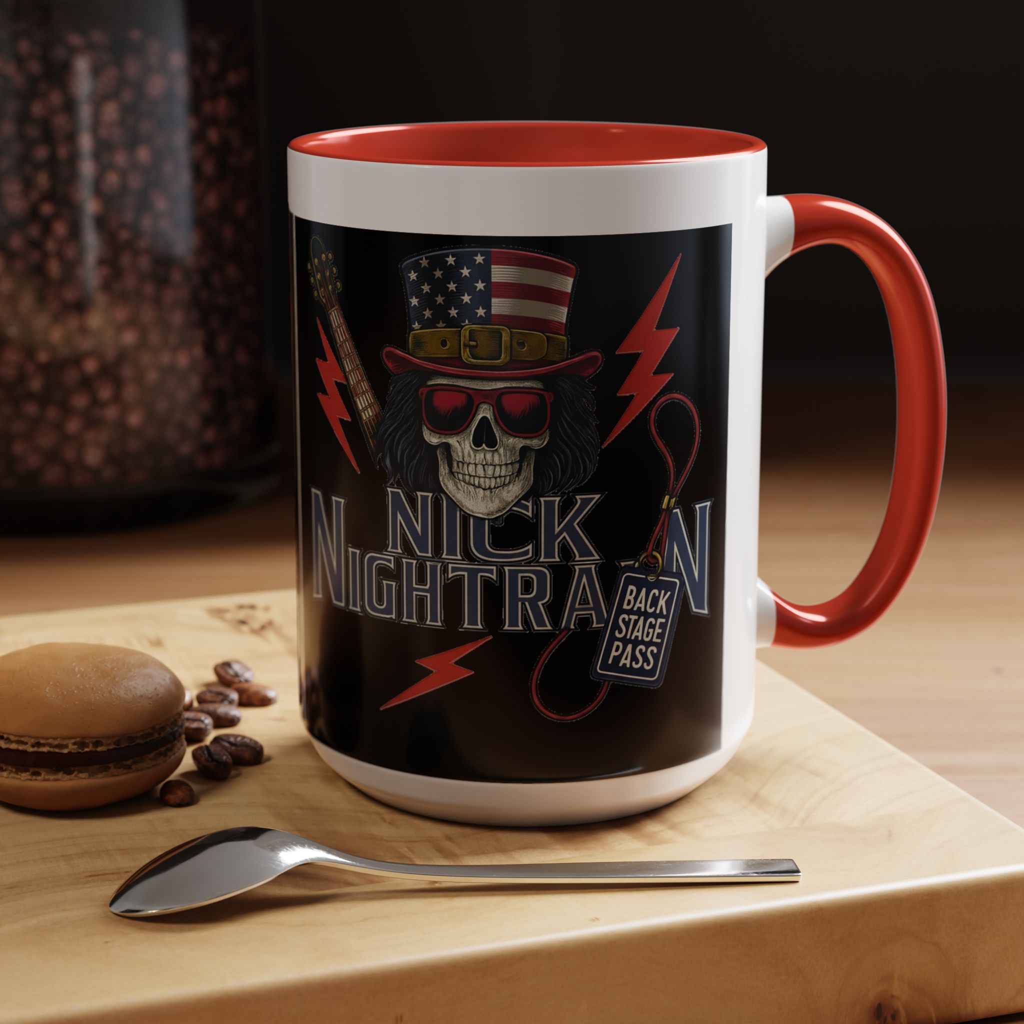 This ceramic accent mug brings full-throttle rock energy to your morning ritual. A bold skull wearing an American-flag top hat, red shades, and a backstage pass graphic wrap around the glossy black canvas, so every sip feels like the first chord of a live set. The colored interior and handle add punchy contrast, while vibrant print quality keeps the design sharp and electric through everyday use. It’s the kind of mug you reach for when you want a little attitude with your coffee — whether you’re cueing up a road-trip playlist, reminiscing about last night’s show, or gearing up for a rehearsal.