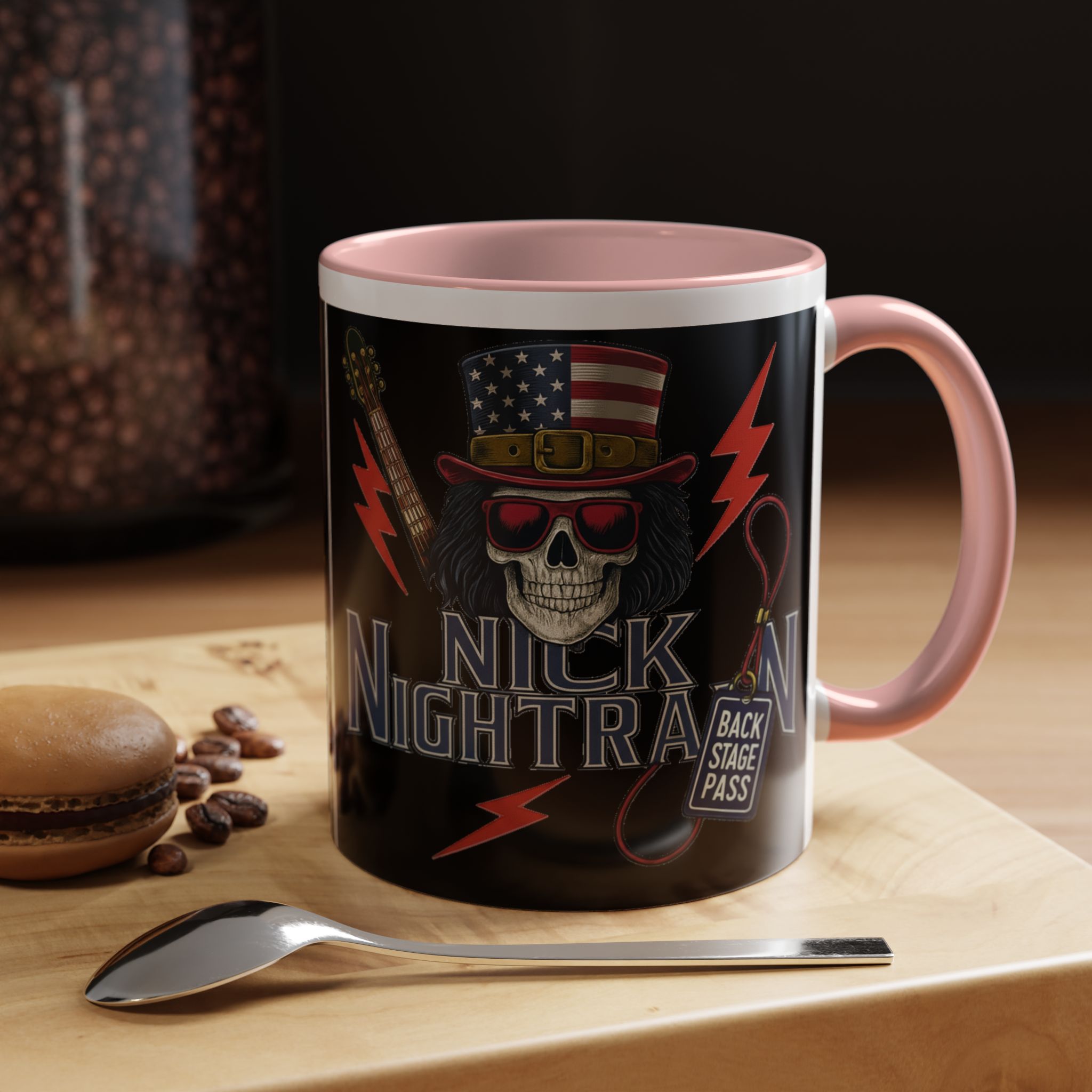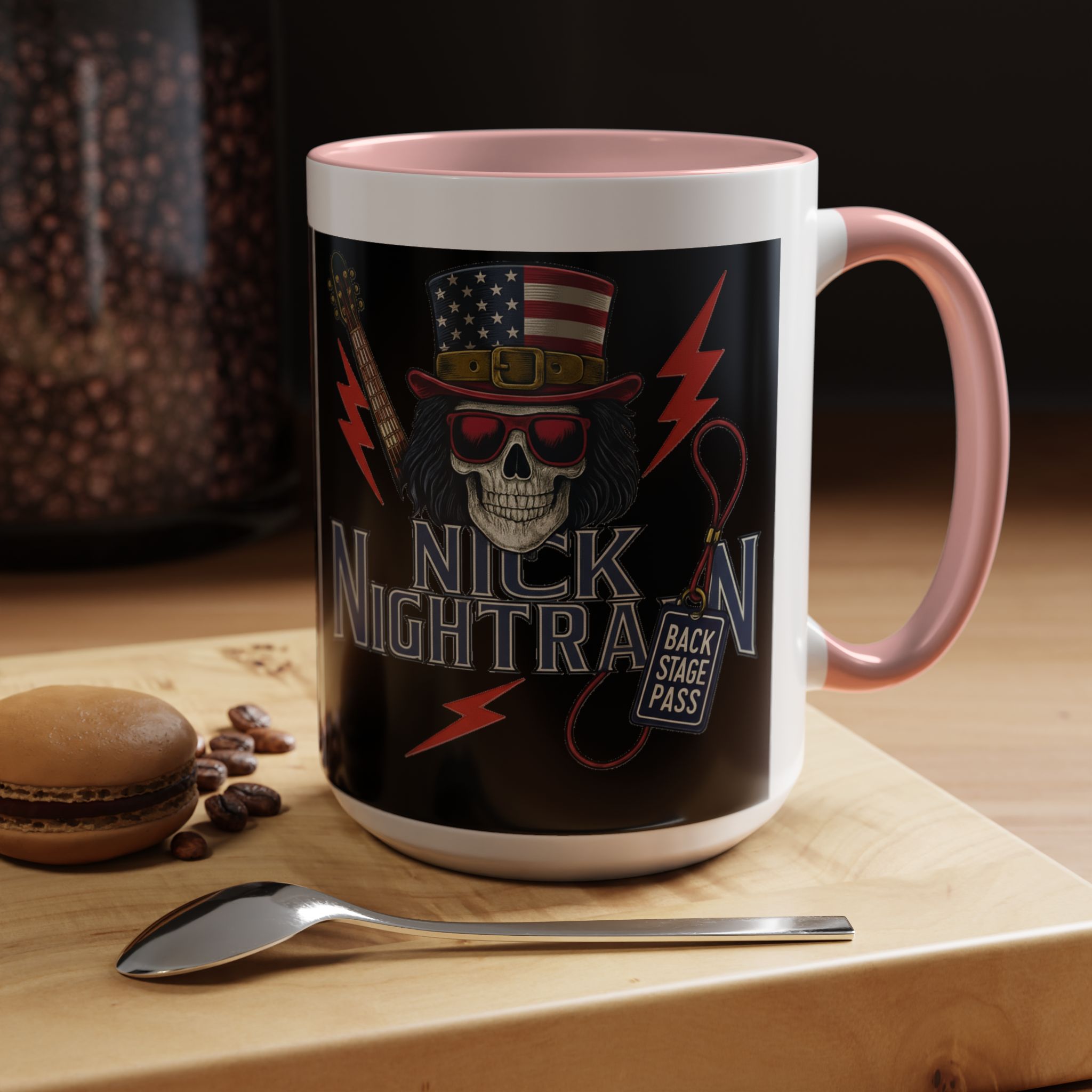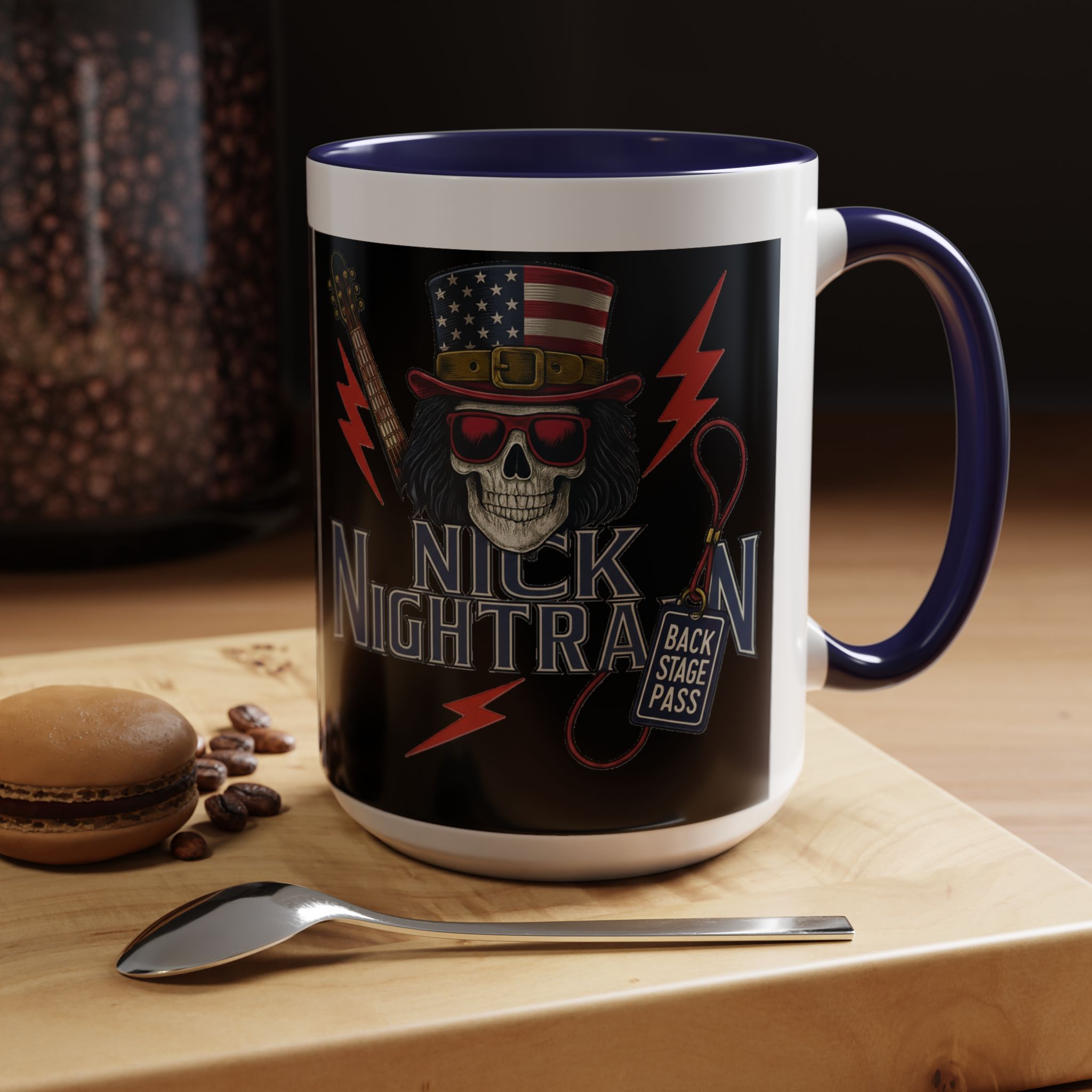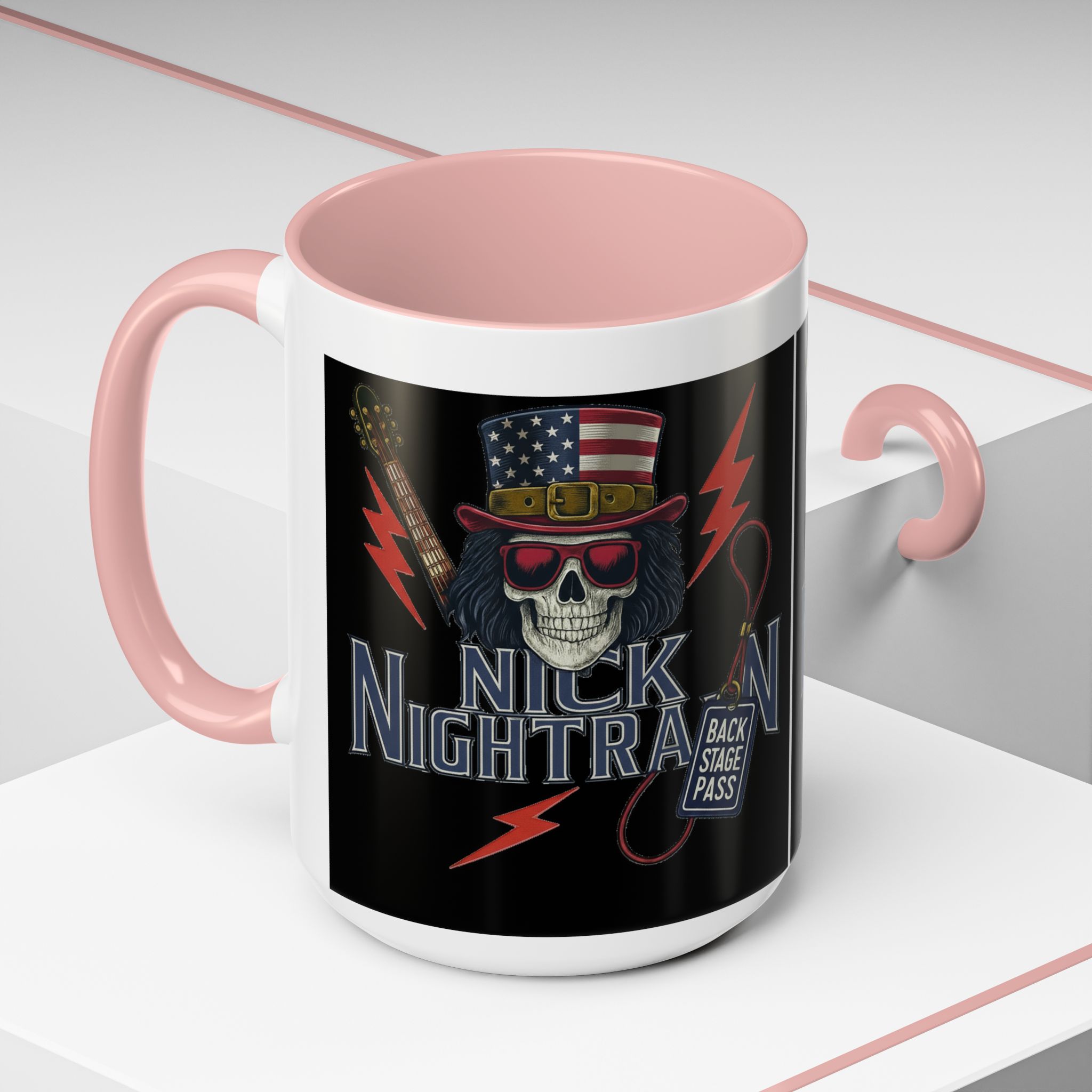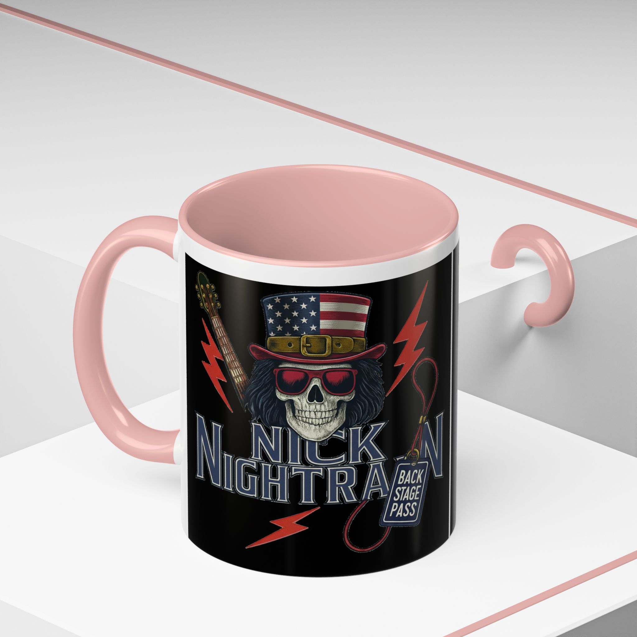 This ceramic accent mug brings full-throttle rock energy to your morning ritual. A bold skull wearing an American-flag top hat, red shades, and a backstage pass graphic wrap around the glossy black canvas, so every sip feels like the first chord of a live set. The colored interior and handle add punchy contrast, while vibrant print quality keeps the design sharp and electric through everyday use. It’s the kind of mug you reach for when you want a little attitude with your coffee — whether you’re cueing up a road-trip playlist, reminiscing about last night’s show, or gearing up for a rehearsal.
