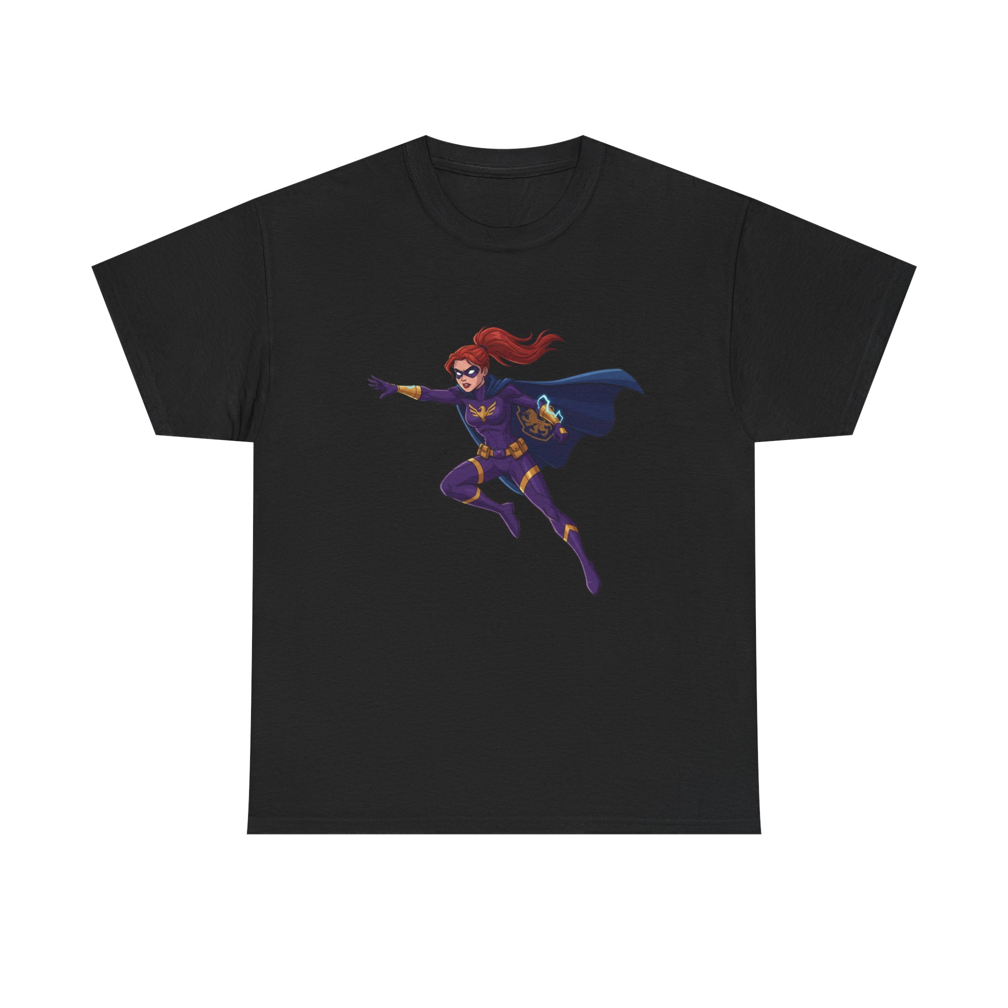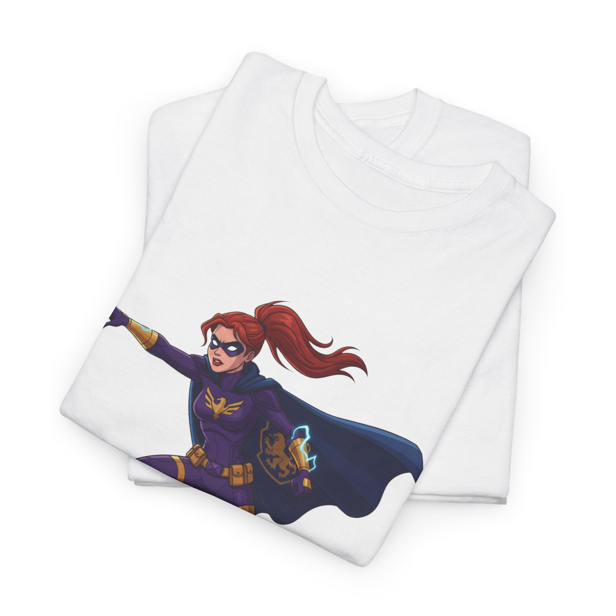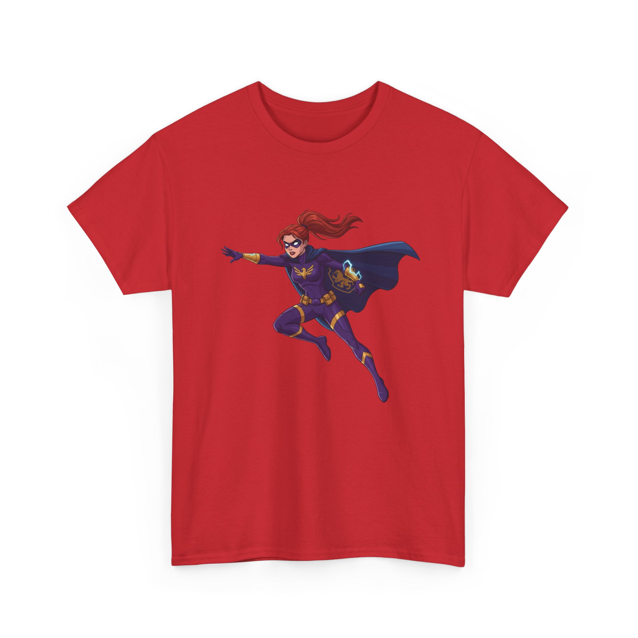 This soft, trusty tee carries a single, vibrant illustration of a red‑haired hero launching into motion — cape billowing, purpose in every line. It sits slightly above center on a clean white canvas, making the figure feel like it’s springing forward from your chest. The fabric has a sturdy, smooth hand that wears in nicely and keeps printed details sharp. Wear it on long convention days, neighborhood comic walks, or when you want to add a quiet, heroic note to an everyday outfit. The relaxed crew neck and classic fit let the artwork take the stage without fuss. Understated, comfortable, and built to keep color and shape through repeated wear.