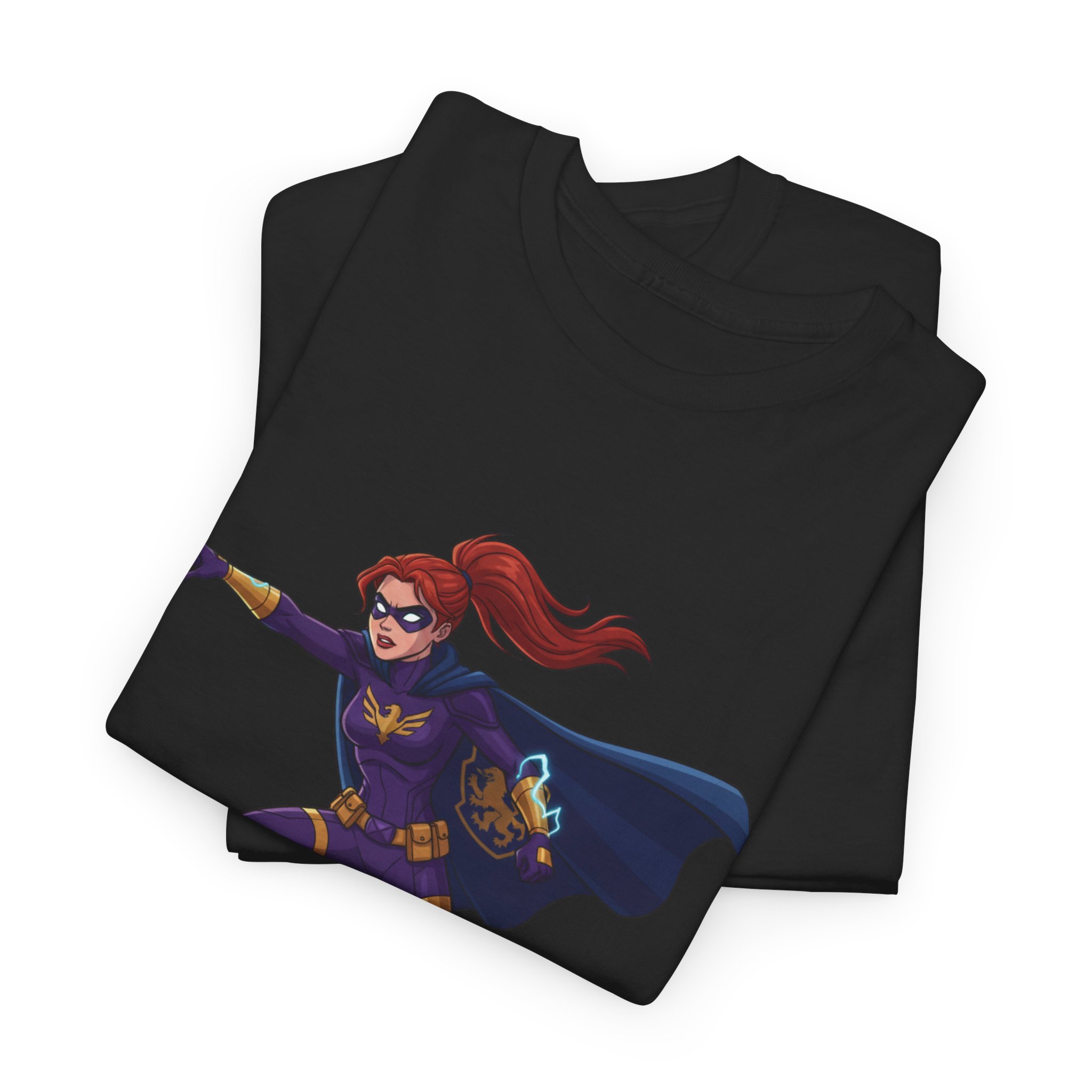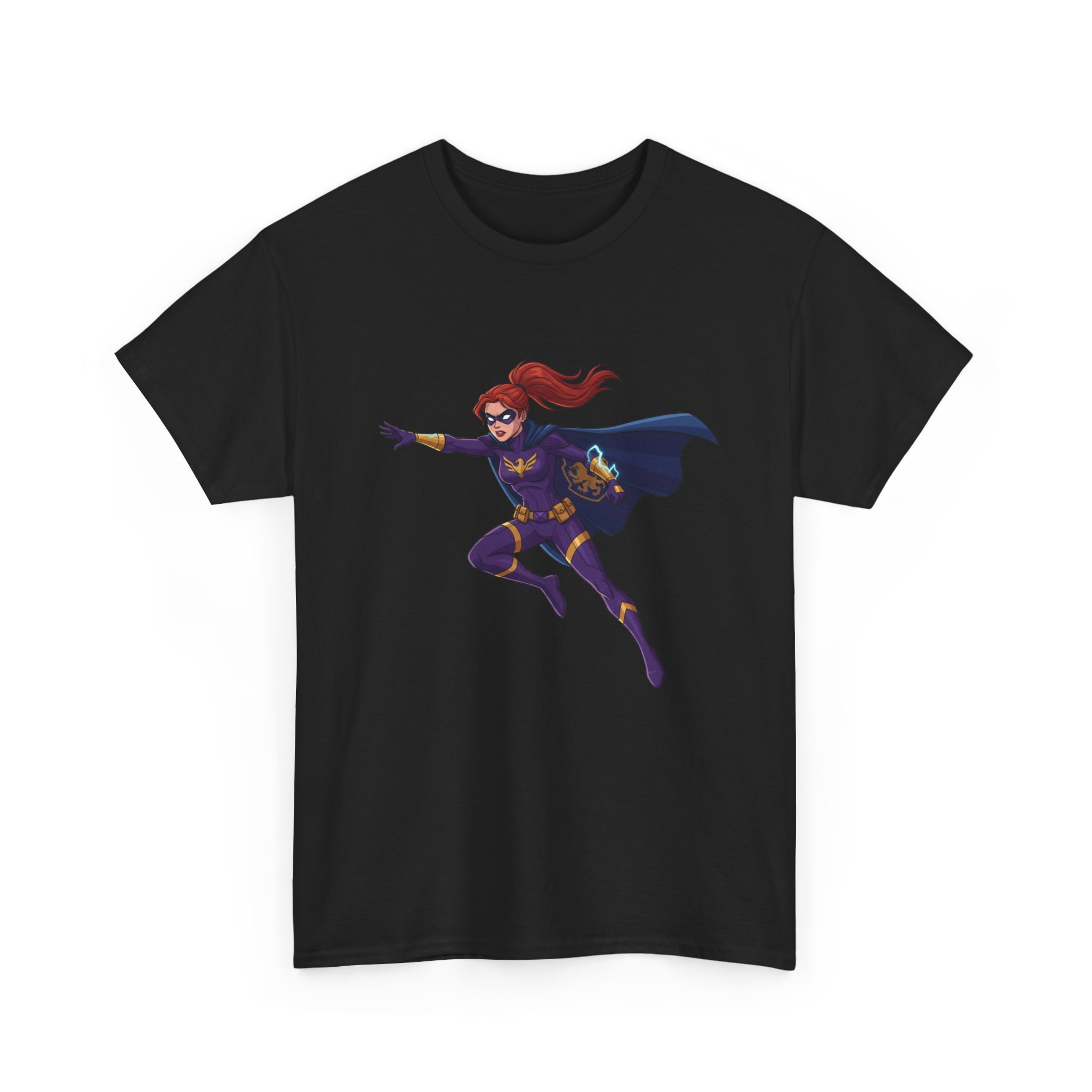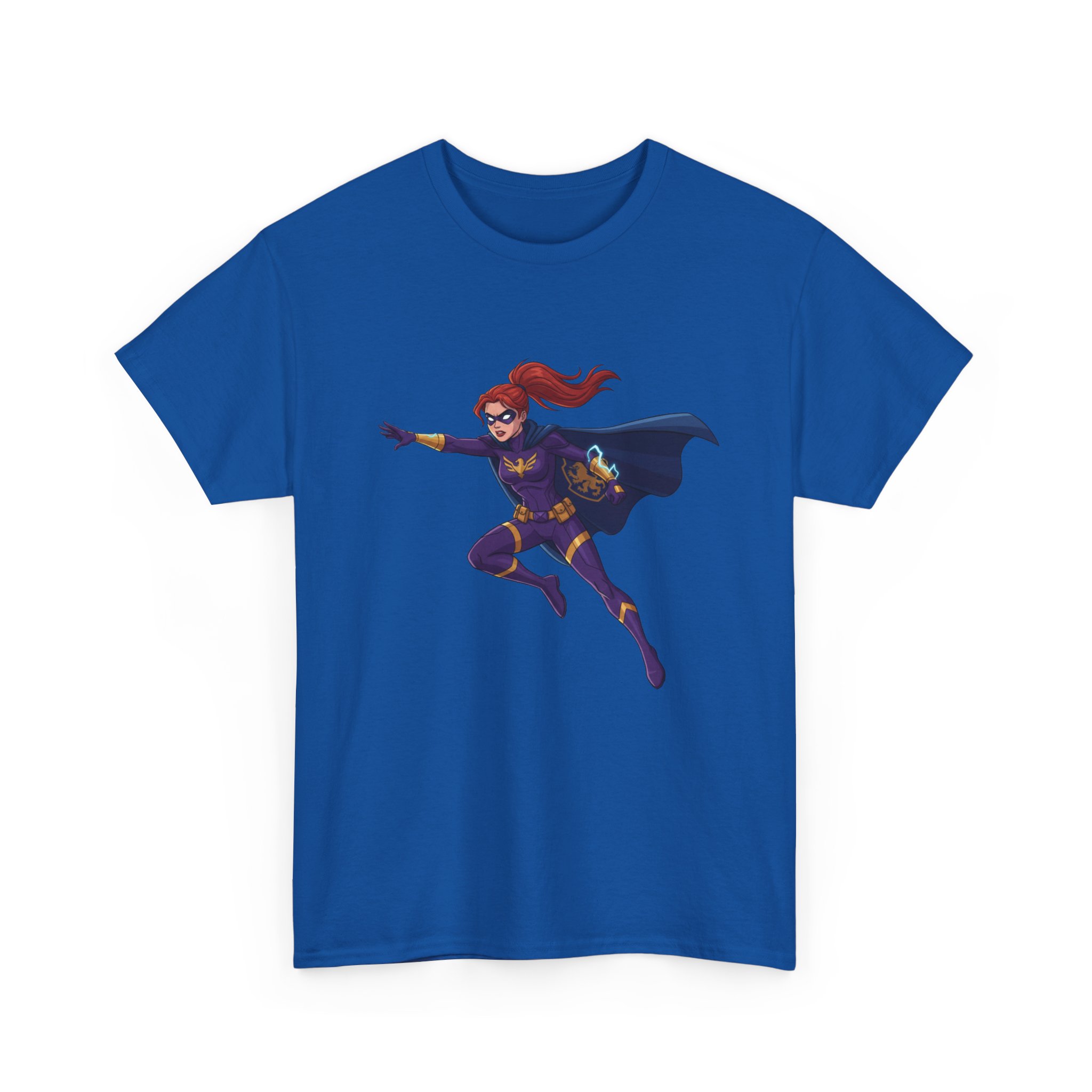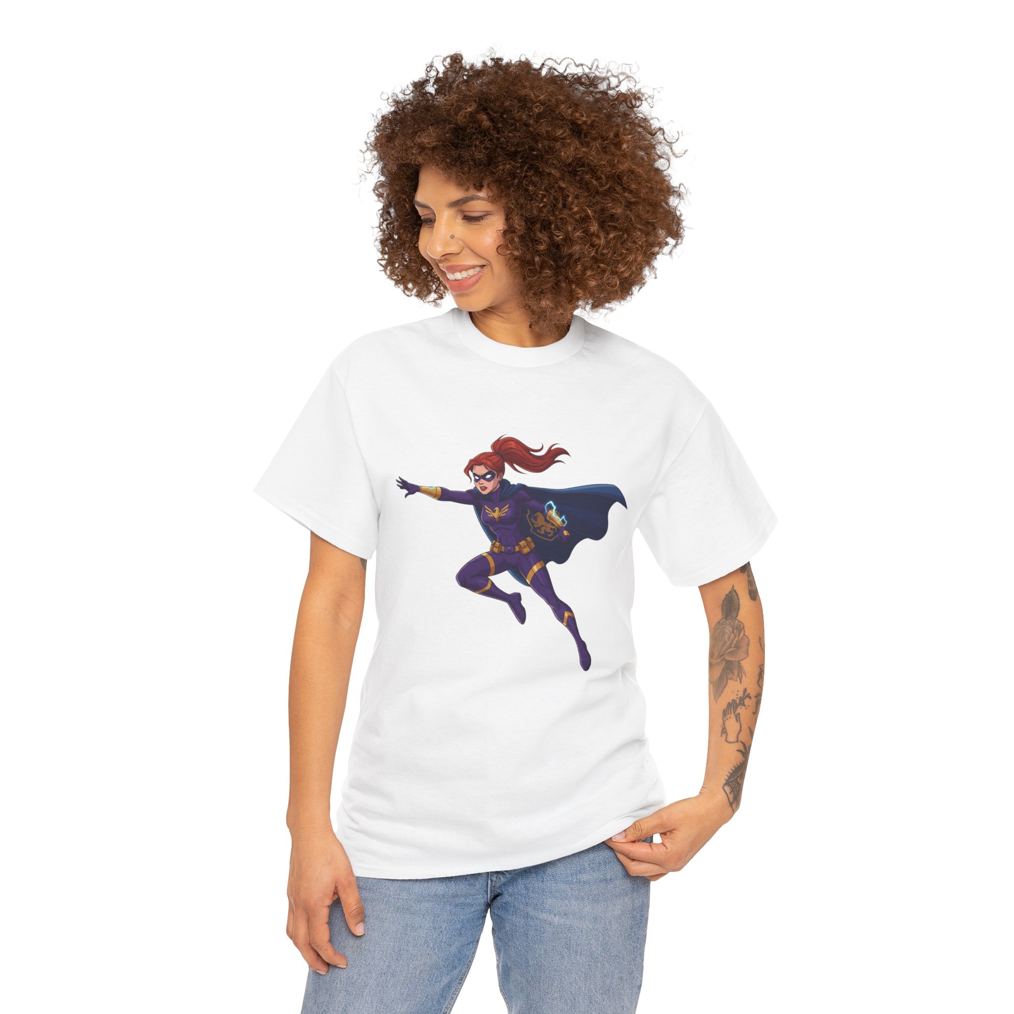 This soft, trusty tee carries a single, vibrant illustration of a red‑haired hero launching into motion — cape billowing, purpose in every line. It sits slightly above center on a clean white canvas, making the figure feel like it’s springing forward from your chest. The fabric has a sturdy, smooth hand that wears in nicely and keeps printed details sharp. Wear it on long convention days, neighborhood comic walks, or when you want to add a quiet, heroic note to an everyday outfit. The relaxed crew neck and classic fit let the artwork take the stage without fuss. Understated, comfortable, and built to keep color and shape through repeated wear.