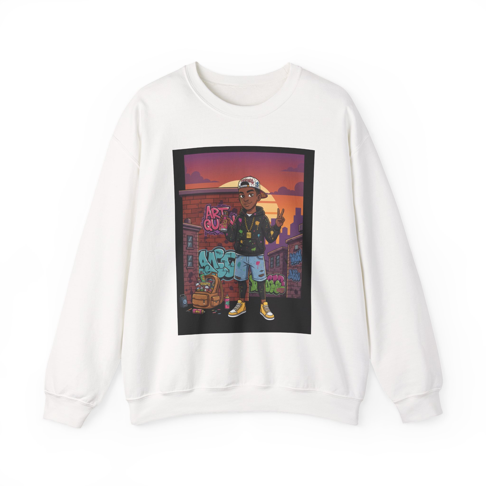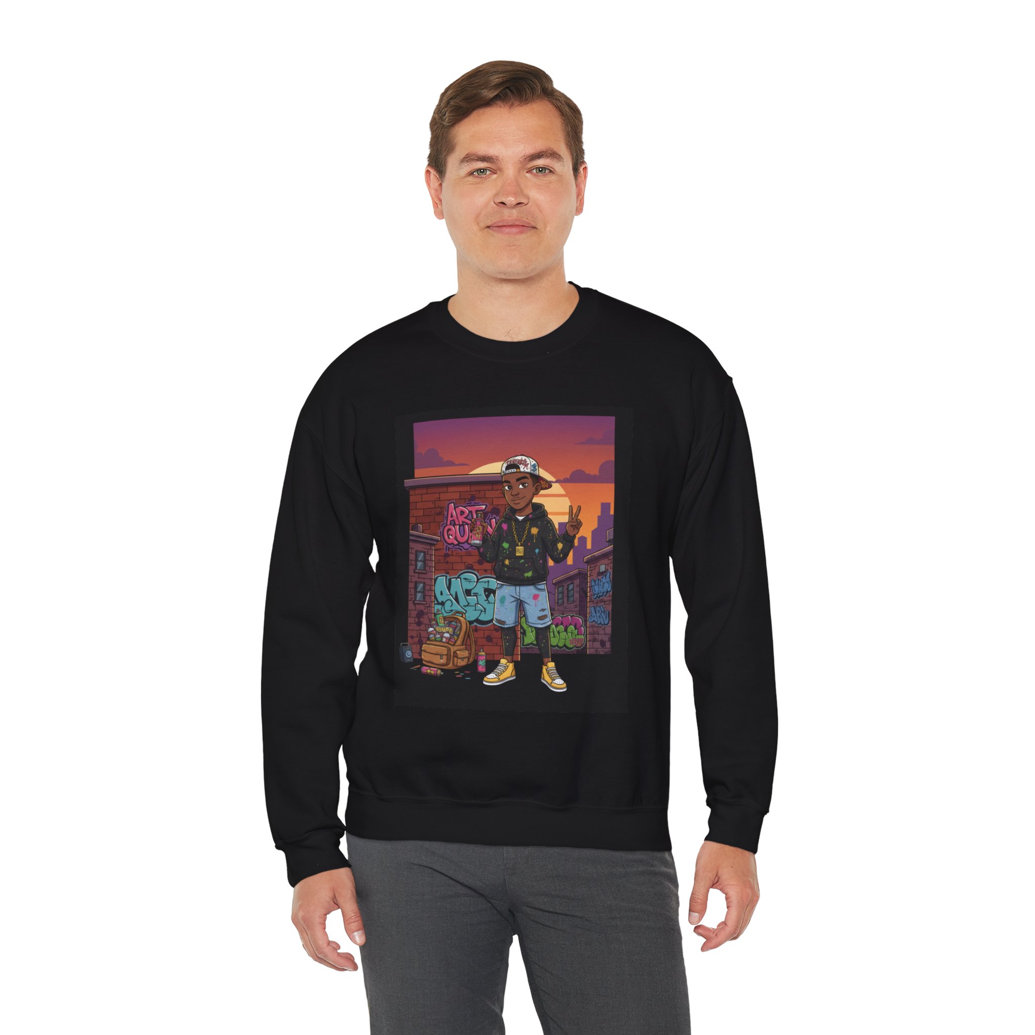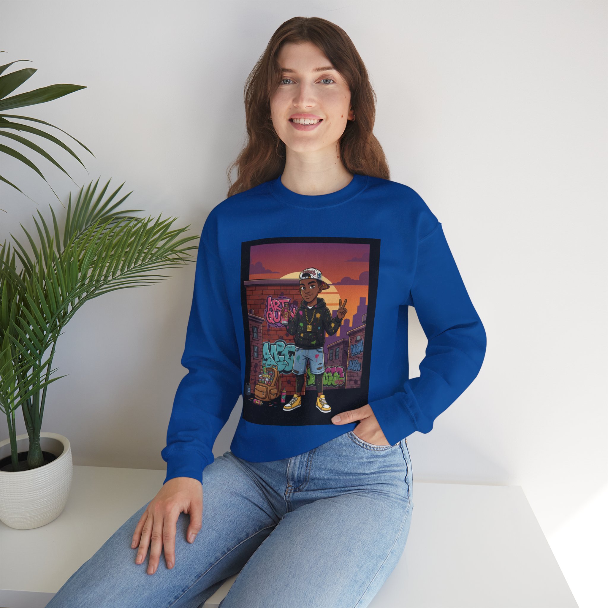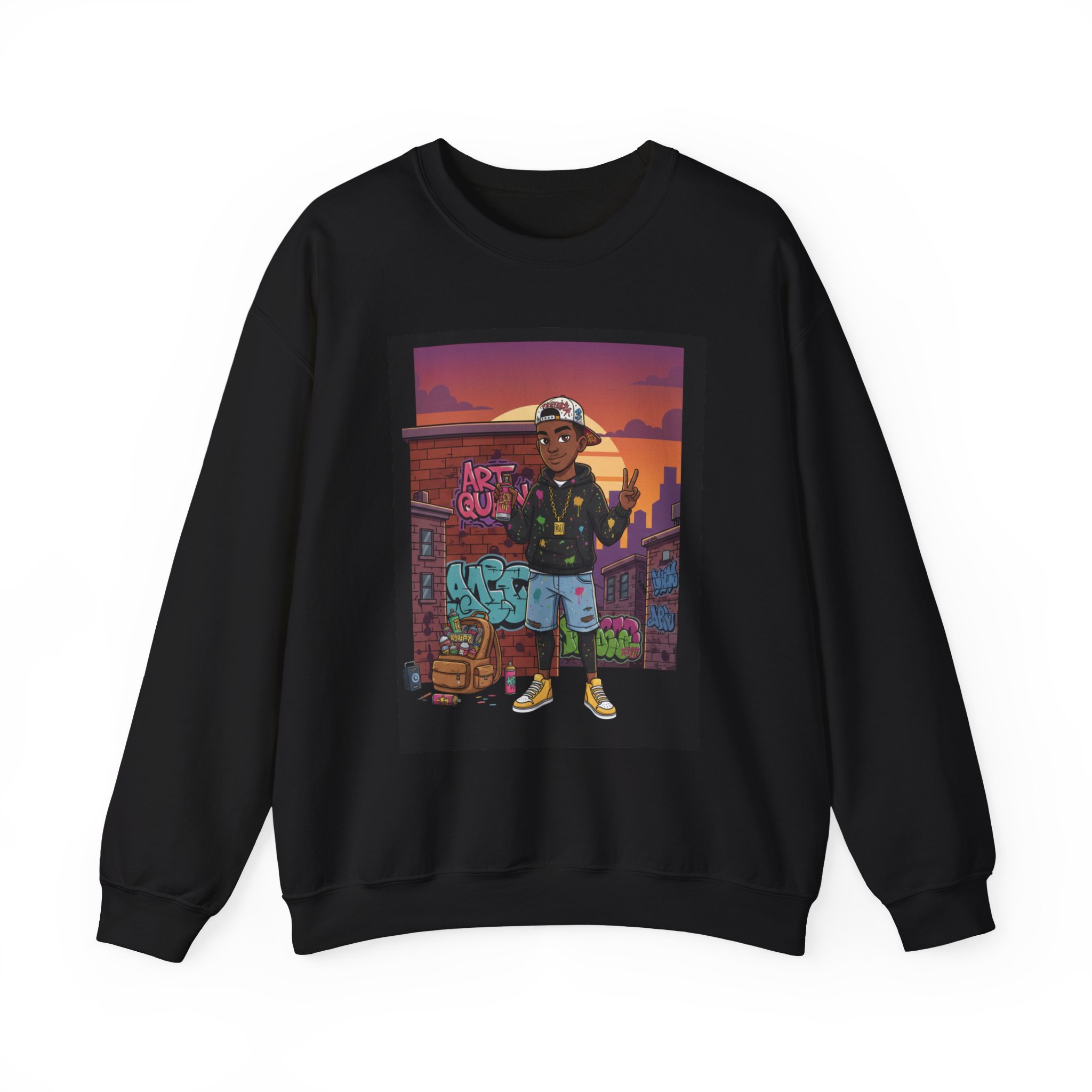 This cozy crewneck carries a streetwise story — a dusk-lit city block, spray‑painted walls, and a young character standing bold in retro sneakers and a bucket hat. The soft, midweight knit wraps you in warmth while the printed art becomes the focal point: colorful, urban, and full of attitude. Wear it on slow evenings walking the neighborhood, layered over a tee for late-night meetups, or when you want an easy piece that reads like your soundtrack and your sketchbook merged. The fabric feels substantial without being stiff, and the clean crew neckline keeps the silhouette simple so the illustration can speak. Ethically sourced cotton and durable double-needle stitching mean this sweatshirt will stay familiar through seasons of wear and stories.