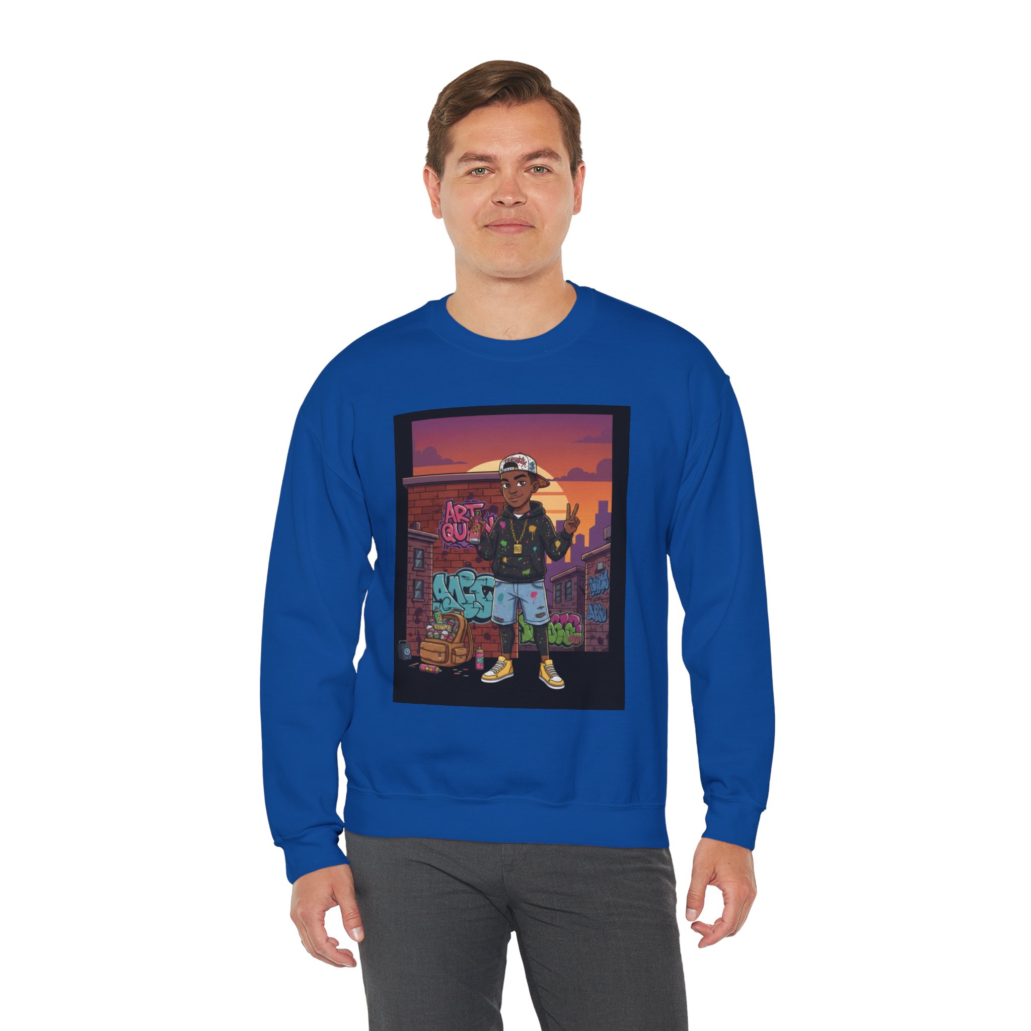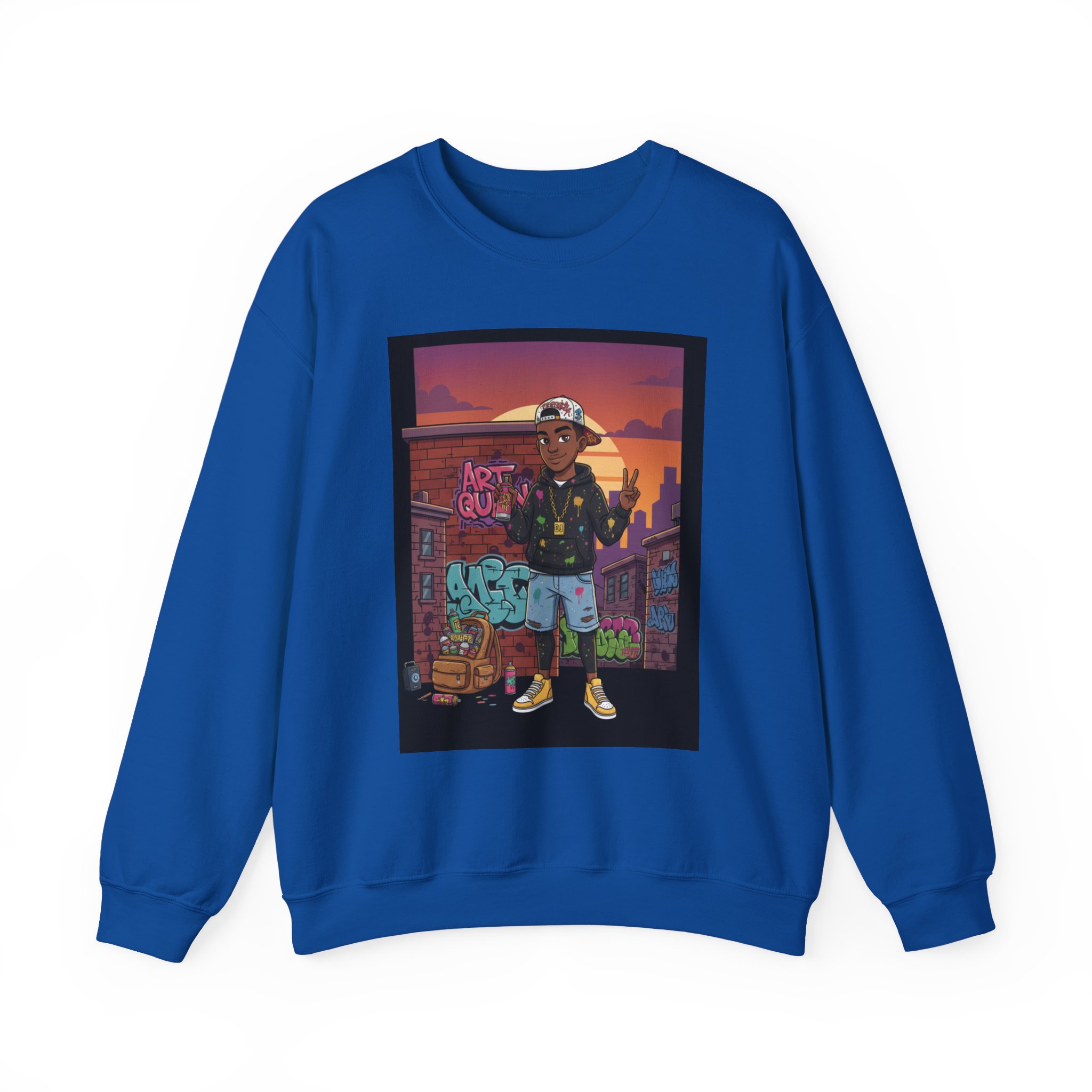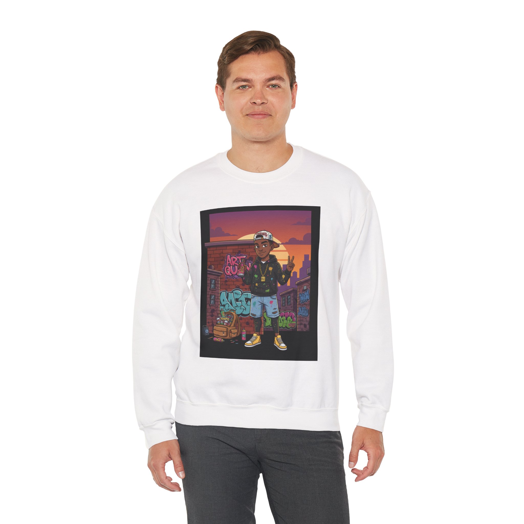 This cozy crewneck carries a streetwise story — a dusk-lit city block, spray‑painted walls, and a young character standing bold in retro sneakers and a bucket hat. The soft, midweight knit wraps you in warmth while the printed art becomes the focal point: colorful, urban, and full of attitude. Wear it on slow evenings walking the neighborhood, layered over a tee for late-night meetups, or when you want an easy piece that reads like your soundtrack and your sketchbook merged. The fabric feels substantial without being stiff, and the clean crew neckline keeps the silhouette simple so the illustration can speak. Ethically sourced cotton and durable double-needle stitching mean this sweatshirt will stay familiar through seasons of wear and stories.